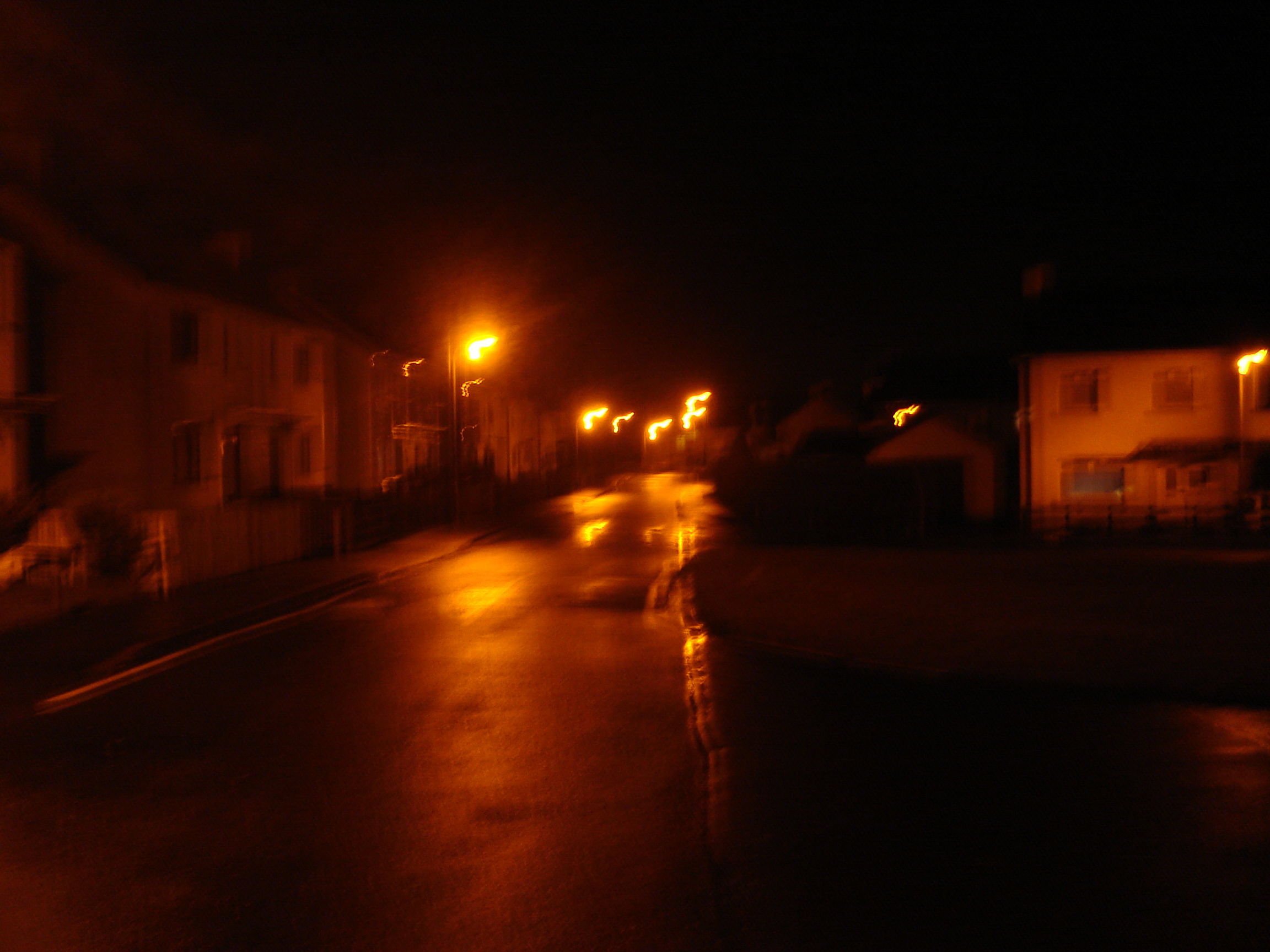 Walking up through a housing estate, and everything has a beautiful orange glow from the streetlights. I love it.