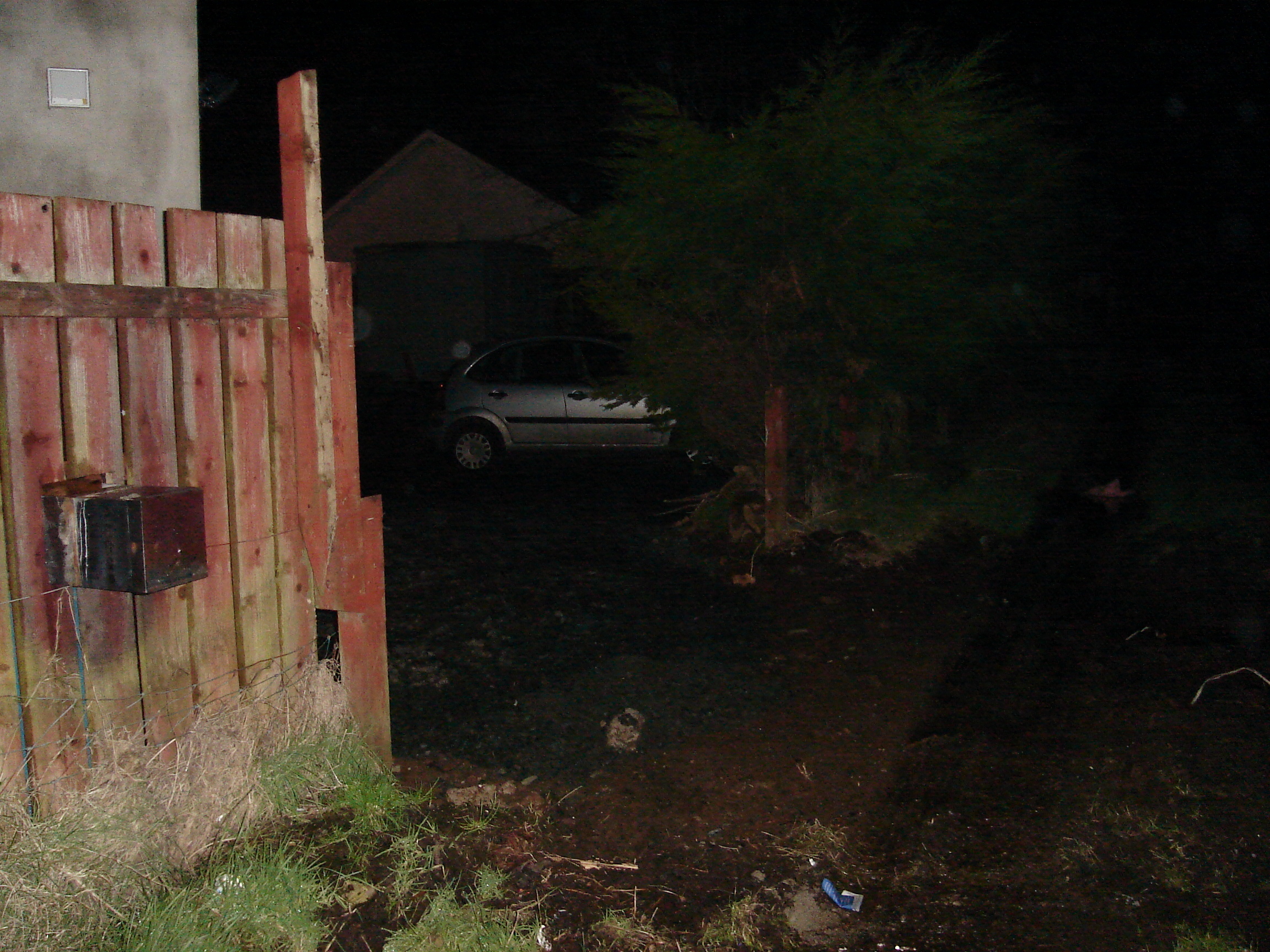 Around halfway down the path (which was surprisingly long), I didn't find a fence. I should have, but I did not, for there was a gaping big hole in it. On the other side of this hole was the driveway of someone's house, with a car parked in it.