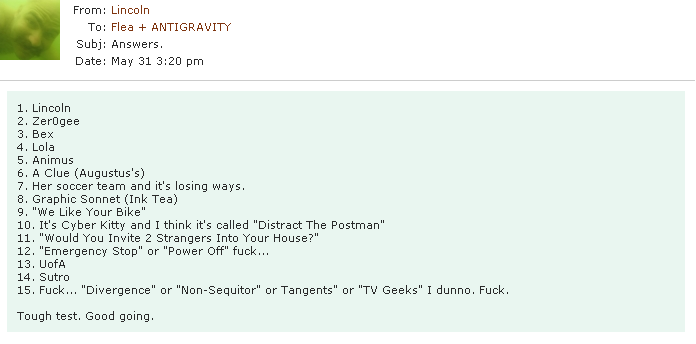 "Screw you Flea." - Ben, on Audio Test, Question 6.