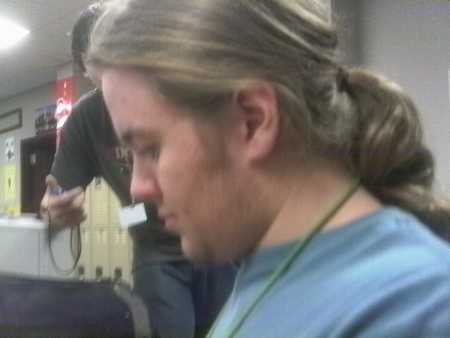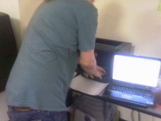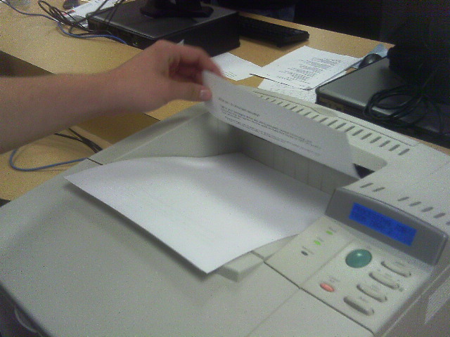 but is thwarted when his printer runs out of paper! He runs to the alternate printer and gathers a handful of paper!