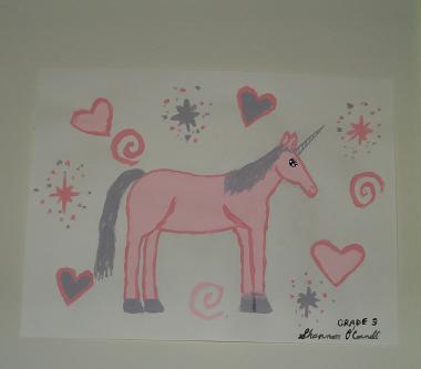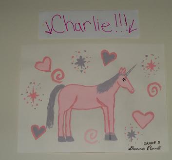 This was inspired by a movie short of a unicorn named Charlie. This only makes the piece better because it will be moderately annoying to the person who drew the unicorn. She hates this particular short and while she was painting her unicorn I kept trying to convince her to name it "Charlie". She refused...thus, I decided to do it for her. The next part of this will to see how long it takes before she notices the change...