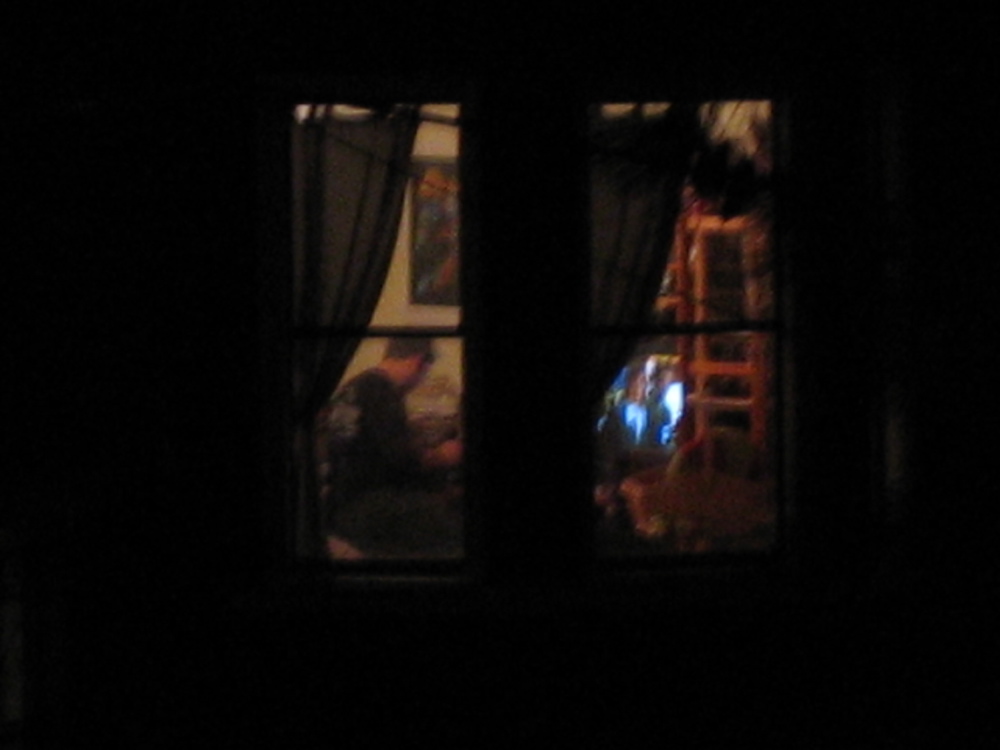 A winding street took us down the backside of the hill. We photographed a man watching TV in his apartment. At this point we had almost no idea where we were. We turned east and walked up an extremely steep hill which led us to a bus stop on a deserted corner. It seemed impossible that buses would pass by there. There were no cars and it was very quiet. Suddenly a bus appeared and we stopped it and jumped on in the middle of the intersection. It was dark outside and the windows had a lot of glare from the lights inside, so we couldn't really see anything going by. The bus was a like an airplane, a transportation pod. We were at Market in a flash and jumped off. At this point it was clear we were on a derive and I tried to say something coherent about psychogeographical truths standing in the fountains in UN Plaza.