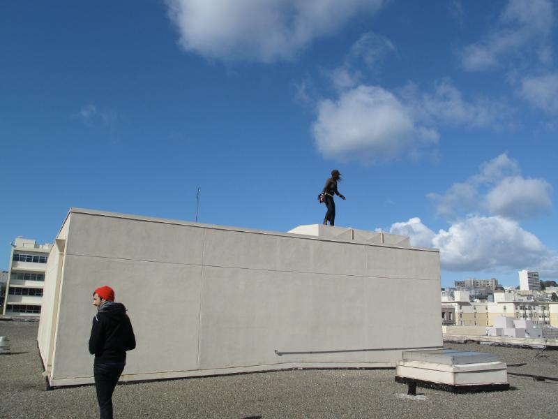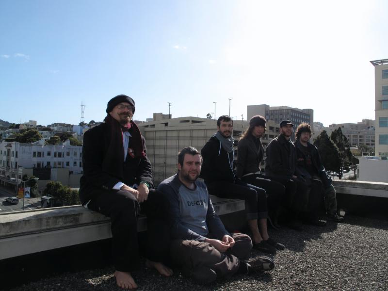 We were convinced that there had to be more to this corner so we entered the building that occupied the corner. We decided to take the elevator to the top floor. Once on the top floor a door was discovered that led to a storage type room, and in the back of the room a door was discovered that led to the roof. So after our intrepid group found roof access, we went to the corner of the building and took a group photo (with Sutro in the background).