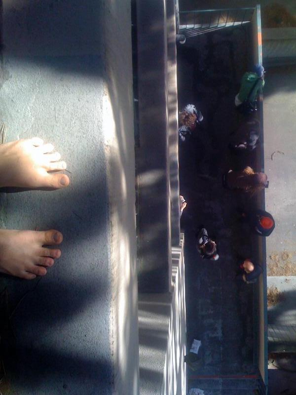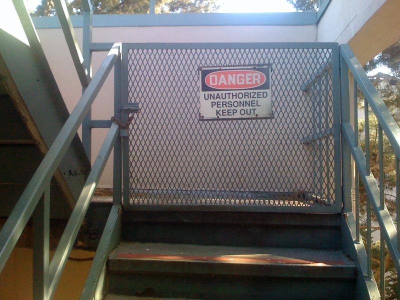 The main feature of the South East corner was an apartment complex with giant pine trees growing in front of it. A woman walked by and Bjorn and Lincoln got into a conversation with the nice lady about the corner and it's features. We discussed the signs and possible future corner improvements, and the nature of the Mundane Journey. We decided to check out the apartment building. On the side closest the corner were the fire stairs. We all decided it was best to take those fire stairs to the top. When we got to the floor and before the stairs got to the roof there was a chain obstructing the roof access with a sign hanging from the chain instructing all unauthorized persons to keep out. Since we had to find roof access (again), we had to trespass on the way. Now that we all made it up to the roof, there wasn't much to see. It was just a gravel roof. But we explored it thoroughly. We took a group photo, but it was taken on Sam's camera (because Lincoln's good camera ran out of battery) and Sam hasn't uploaded photos yet. Maybe someday you'll get to see that group photo.