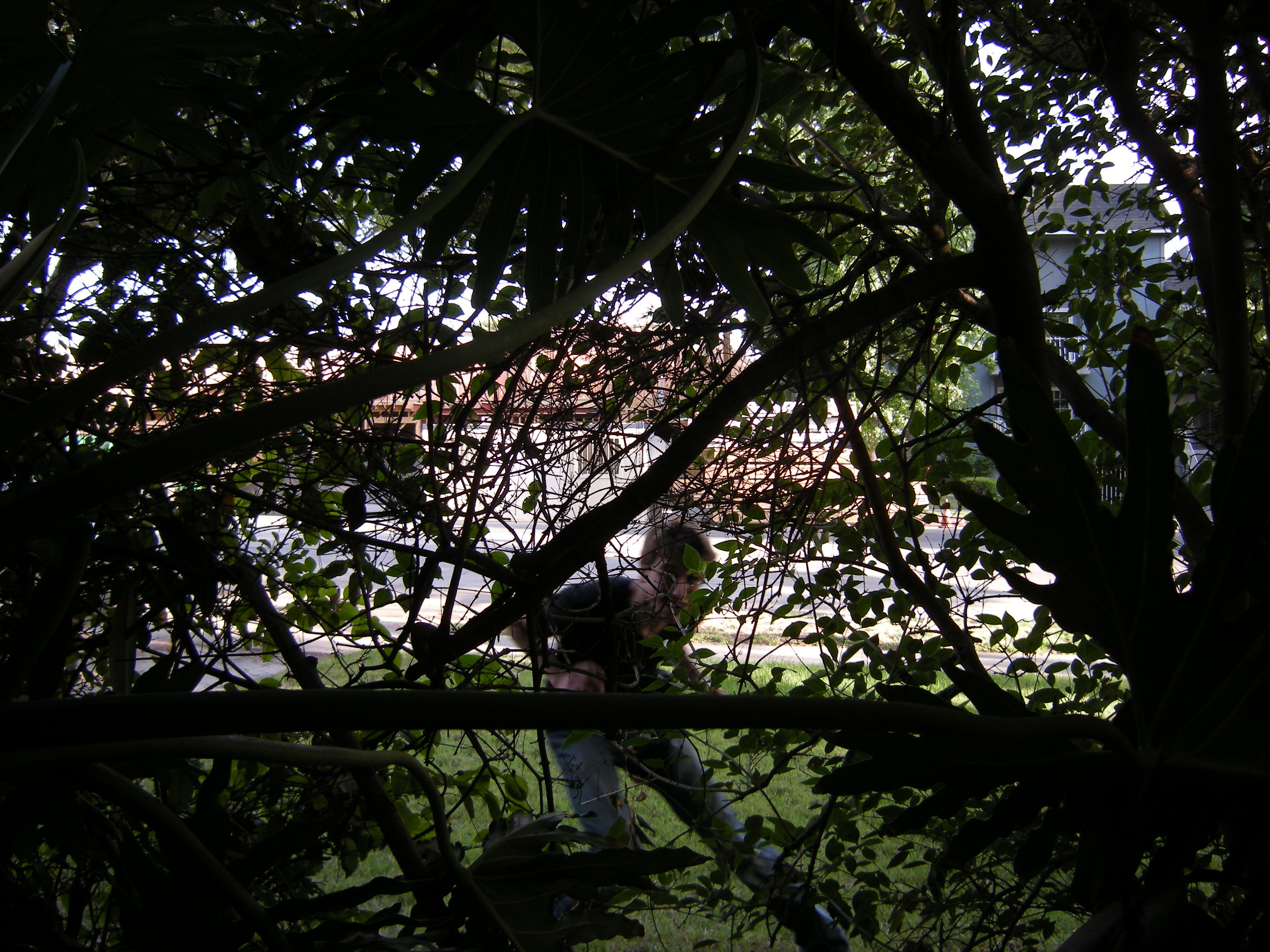 I decided that I would take a shot through the vegetation guarding my front porch, so I heaved a hefty potted plant off of a stone pedestal outside of my front door, and picked an angle. It was at that moment that I realized that my camera had only two timer settings: Ten seconds, and three seconds. It also occurred to me that ten seconds would be too long of a time to get into frame. With that much time I could just as easily saunter! So I went for the more difficult option, obviously, and set the timer to three seconds ::Gulp!::