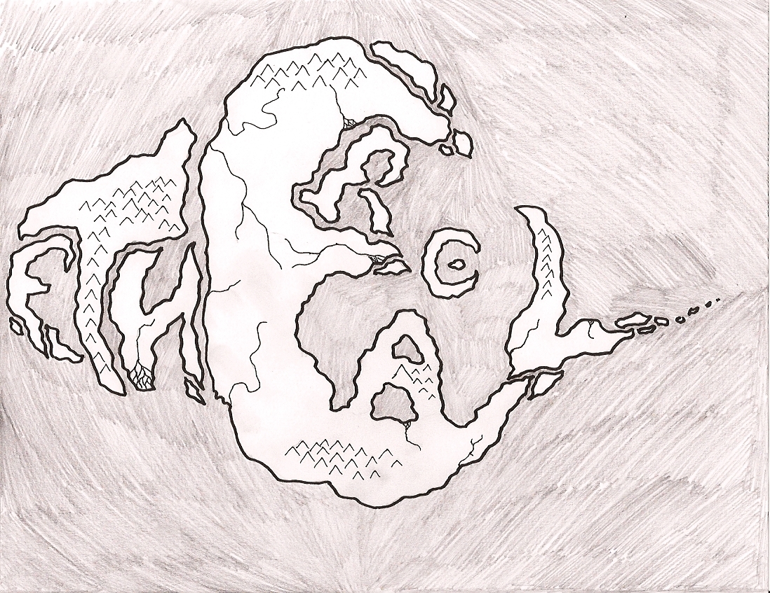 I had a lot of fun with it. I tried to draw a linguistic representation of the word--the H is within the T, building up to the central E, which dominates, catching the following R-E-A within its massive bounds. Beyond it, the L trails off into an archipelago. I had been coming up with clever linguistic jokes as names for the various mountains and inland seas, but I realized--such a world is entirely uninhabited, and to name its features would only take away from the ethereal heart of it. So the map goes unlabeled, remaining simply an open expanse of word.