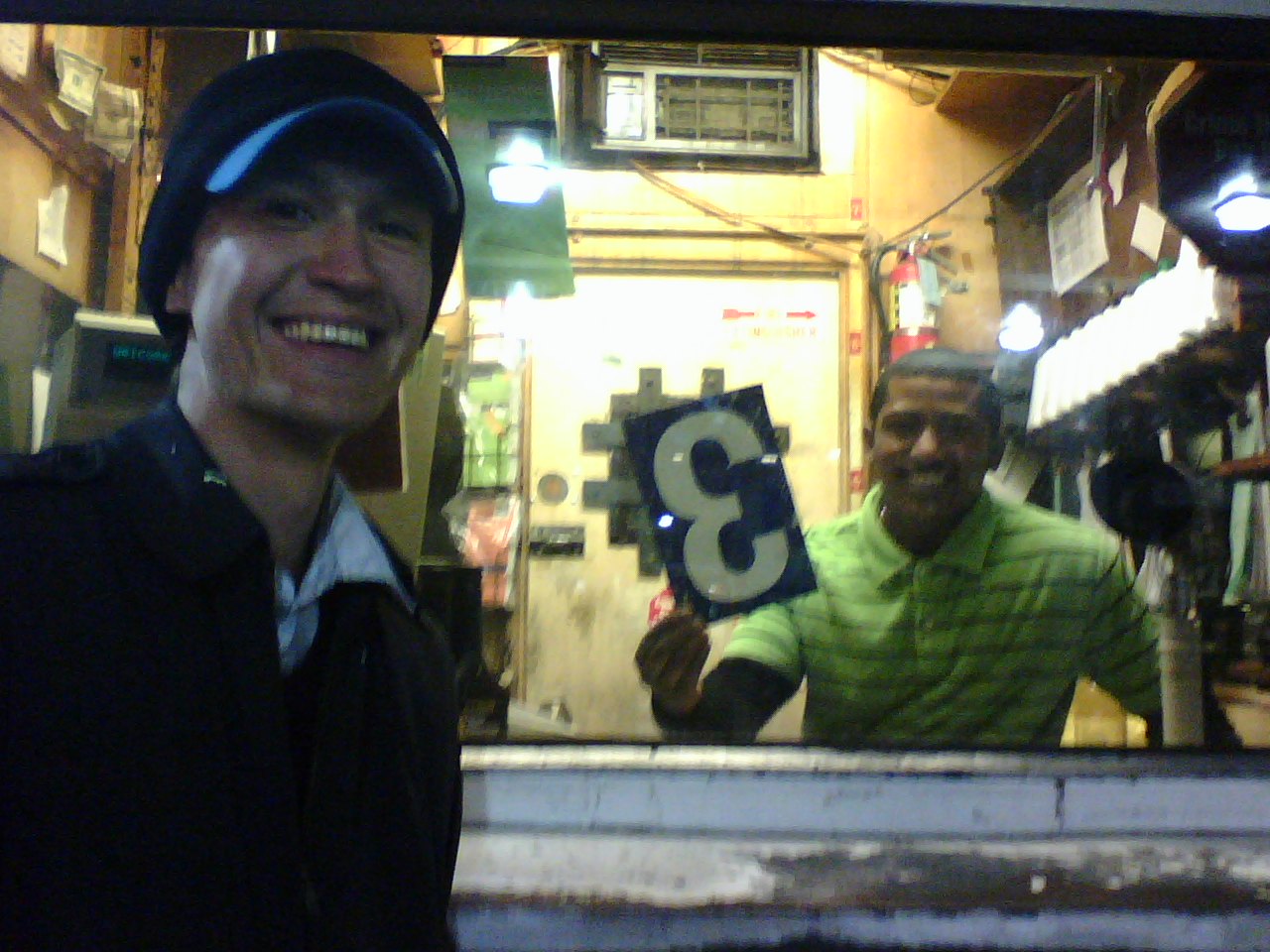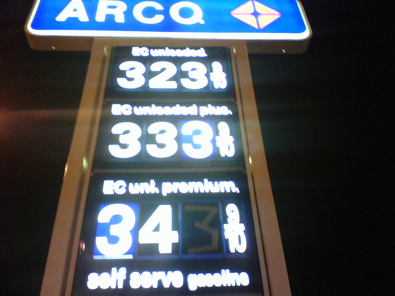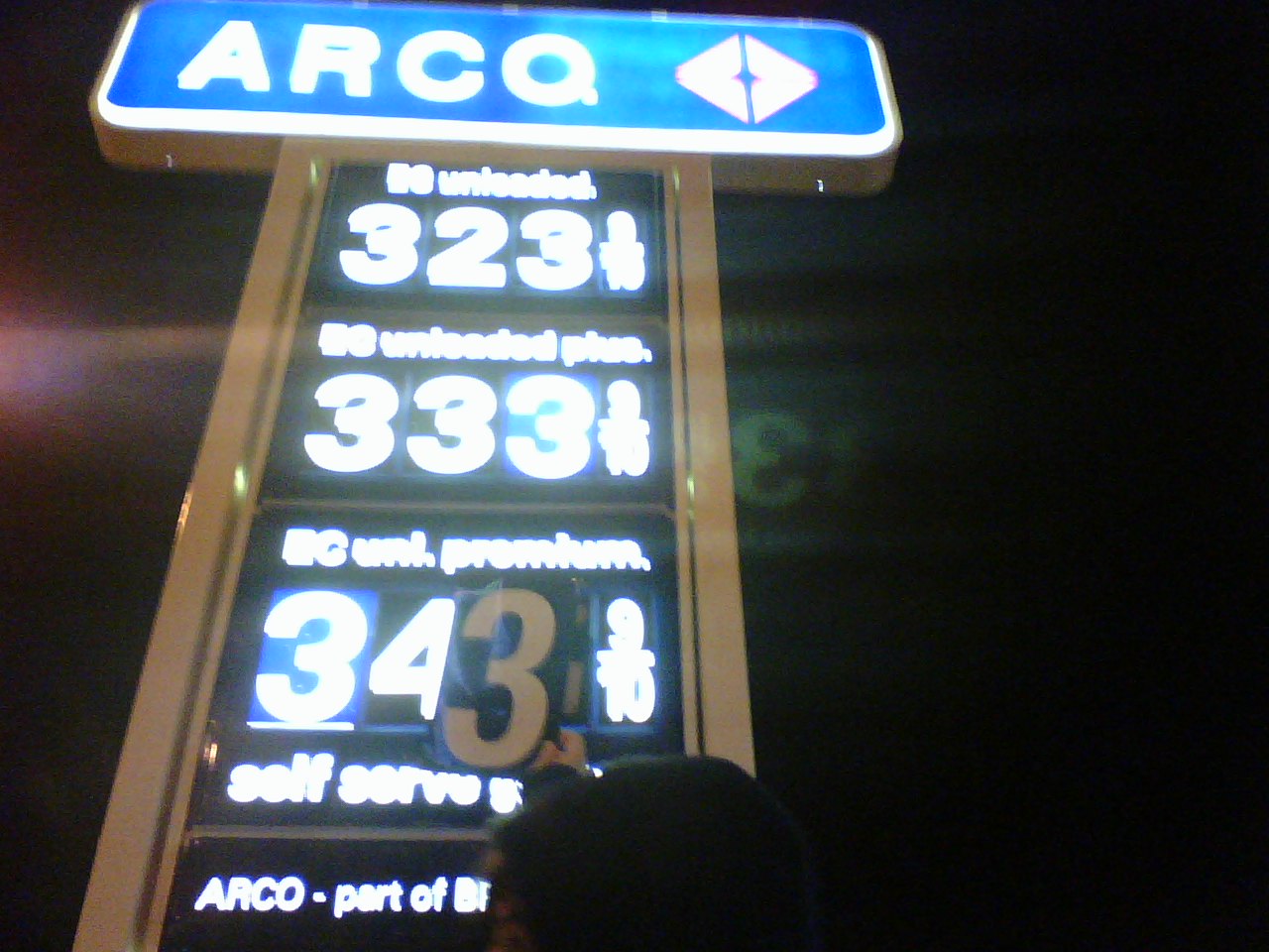 As we wandered down Divisadero, lost, cold, Jack Frost nipping at our noses, we stumbled upon an Arco station at Fell. Basically, this Arco station was the Nobel Prize/Mount Everest of "Places to Put a Three That You Took From Another Gas Station." On their huge, lit up, public sign displaying the prices of their various grades of gasoline, they were missing a 3. The prices that day happened to be $3.23, $3.33, and $3.43 - and apparently they only had six threes available! This meant that they were in dire need of our 3. And we knew just what to do.