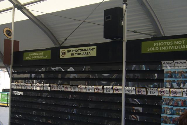 You're moving - at times - through a snaking line. At this bend, your identity is verified by a little guy who scribbles nothing in particular on your papers. The next change in linear direction reveals an inappropriately cheerful man who takes your photo in front of a large picture of the island. When you wonder, out loud, if the conditions there are bad enough they won't even send the photographer, the skinhead in front of you mentions that he heard they at least let you have a copy of your photo after your time, though there's some kind of fee attached. He says he heard about one guy who tried to steal it; doesn't know what happened to him. You wonder if the signs advising against just such a heist back up his story, or helped to write it.
