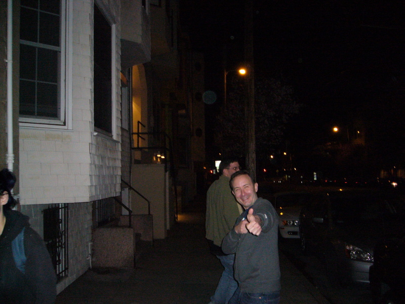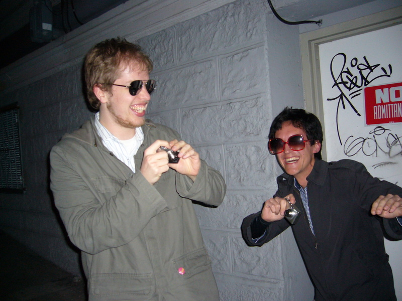 We travelled in a big group, at night, and on a Friday. Here's Orion and Ian with their eyes taped shut behind those shades: