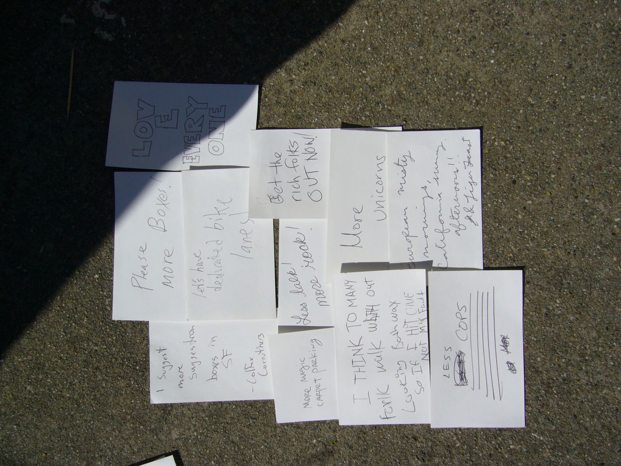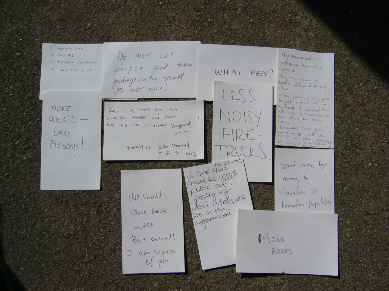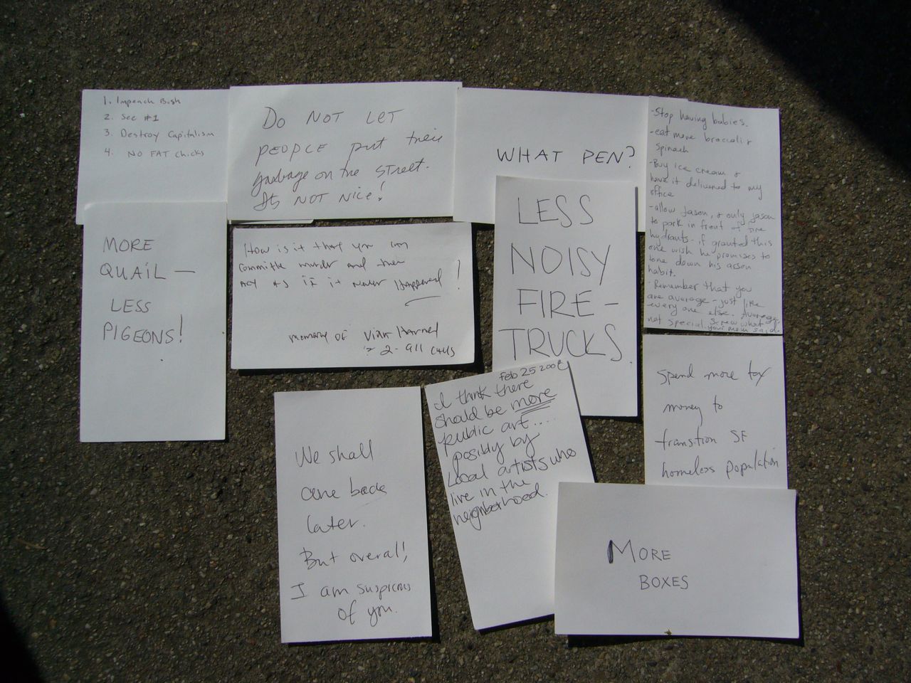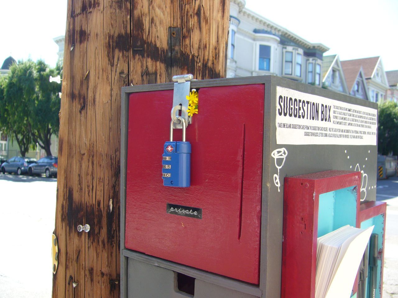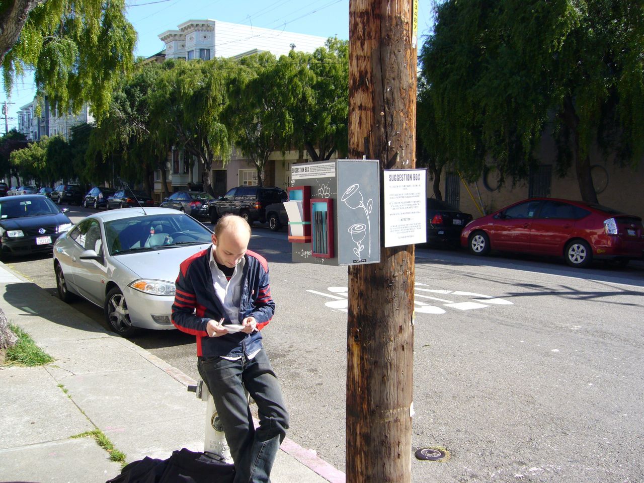 March 20th, 2008 2:17 PM / Location: 37.770989,-122.4319The Waller and Steiner Suggestions Box is a living social experiment (or "dialogue organism") developed to encourage community understanding and engagement, introduce internet-like self-organization strategies into a non-internet environment, and reconfigure notions of authority and responsibility within neighborhoods. Installed under the cover of darkness, The Waller and Steiner Suggestions Box brings light to the aspirations, anxieties, humor, hubris, pet peeves and imaginations of a People.