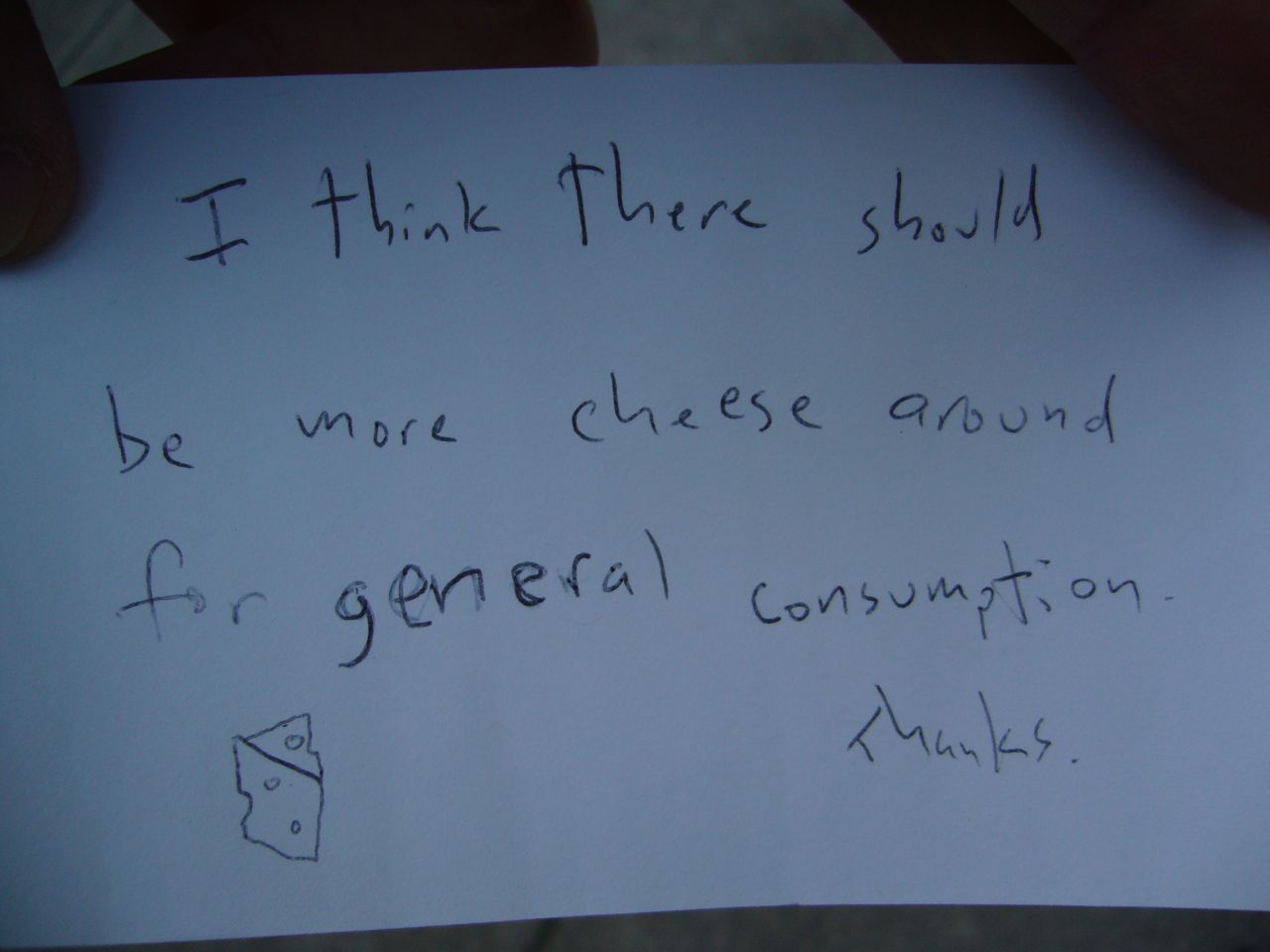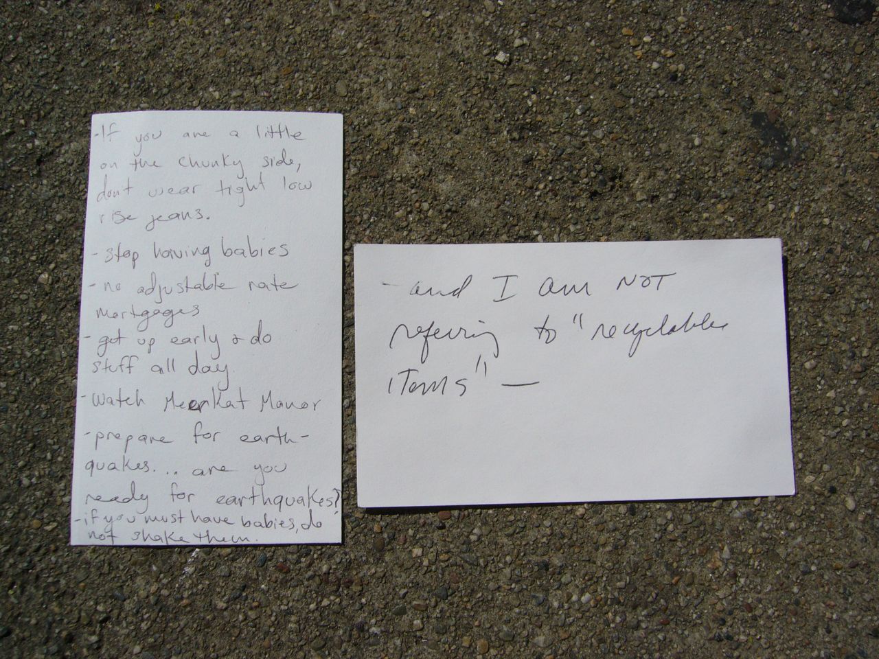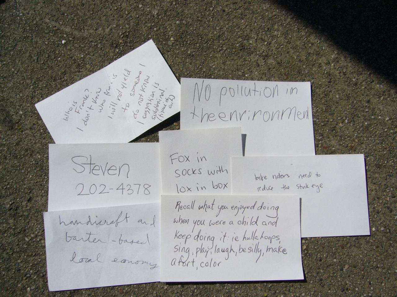 The project launched February 24, 2008, in San Francisco. Private suggestions have been collected for secure analysis, and public suggestions photographed for archival purposes, at irregular intervals since then. It was discovered on March 14th that many of the public suggestions, including a plastic egg containing plant matter, had been taken. The text of the instructions provided to participants, and an incomplete but representative sampling of public suggestions follow.