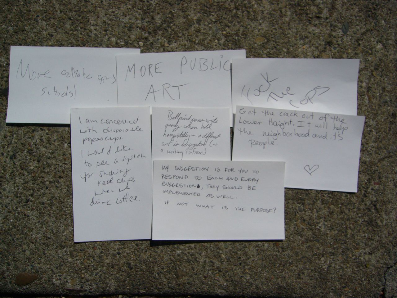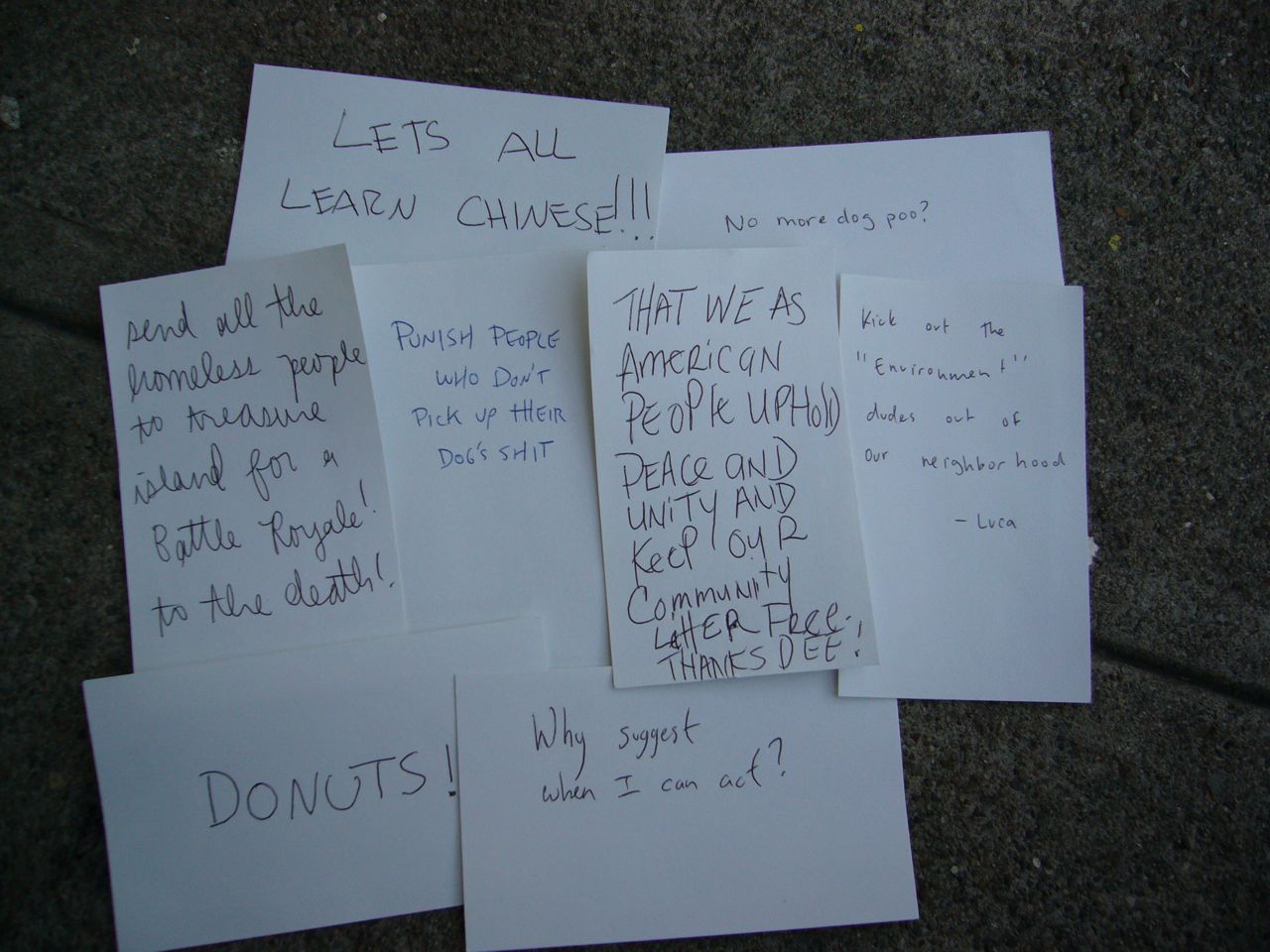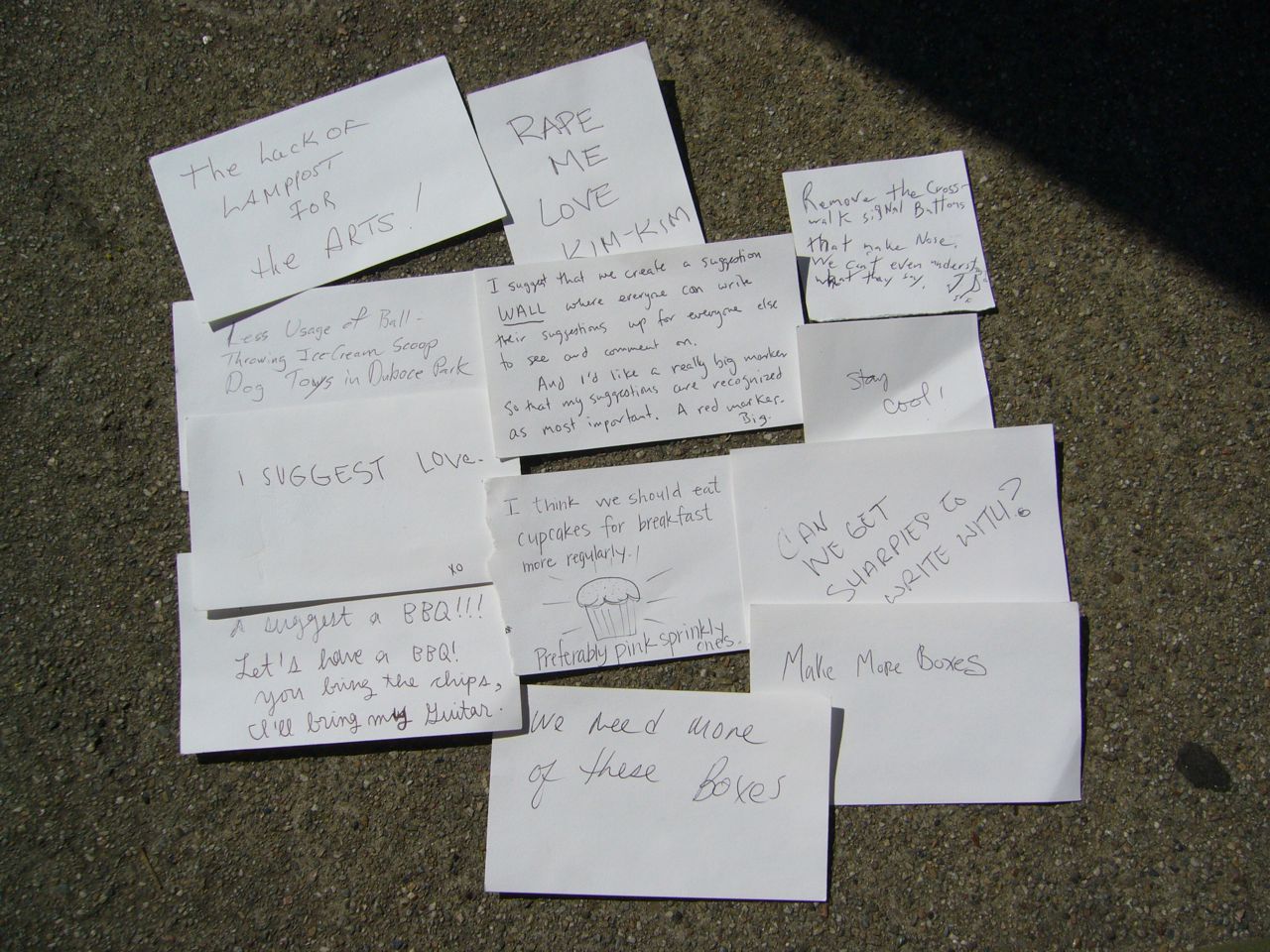 While The Waller and Steiner Suggestions Box is designed to be a tool for individuals and groups to express their concerns and aspirations, it also serves as a platform to discuss neighborhood grievances. Approximately two weeks into the life span of the project, short comments began to appear on "public" suggestions ("right on!", "yes!"). This was a desired effect. Ultimately, the implementation of many of these suggestions can only move forward with the participation of a majority of community members.