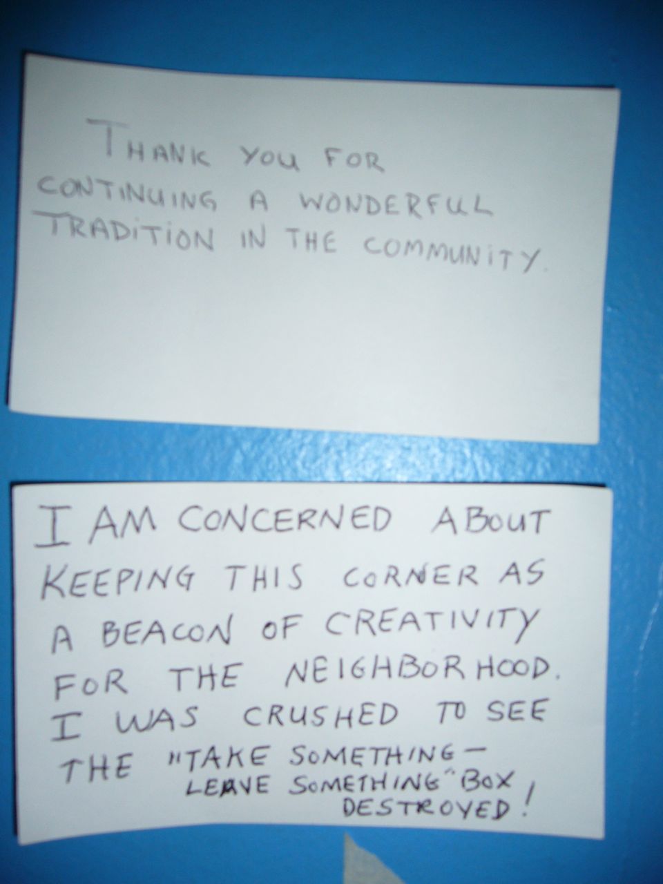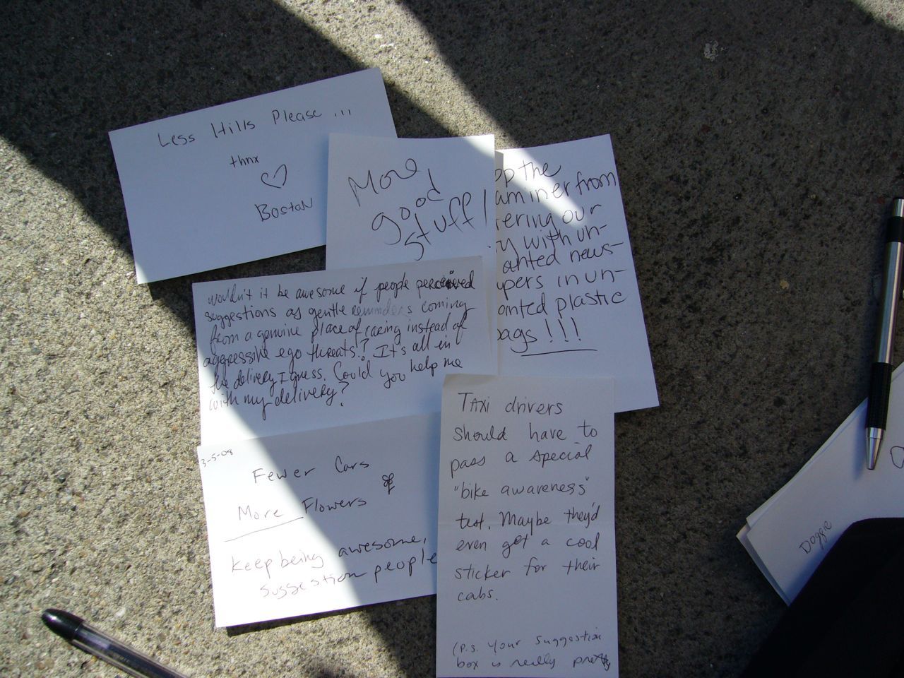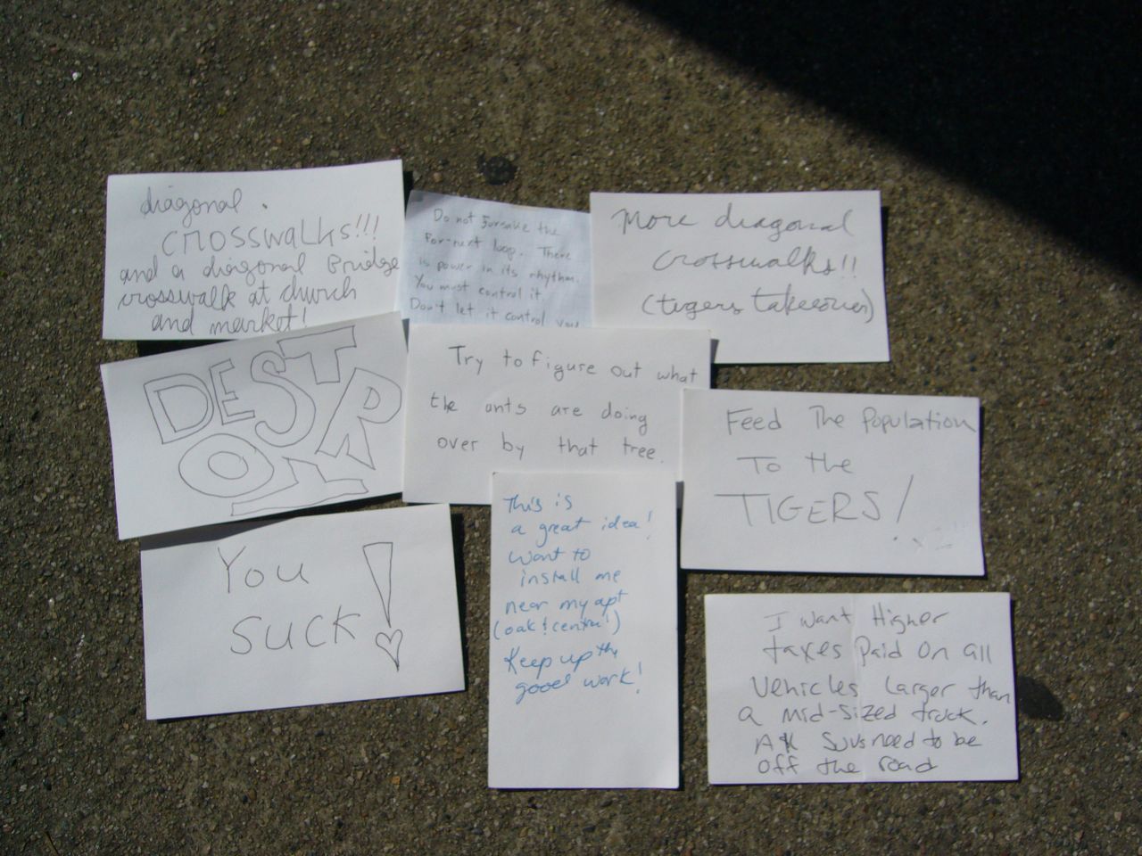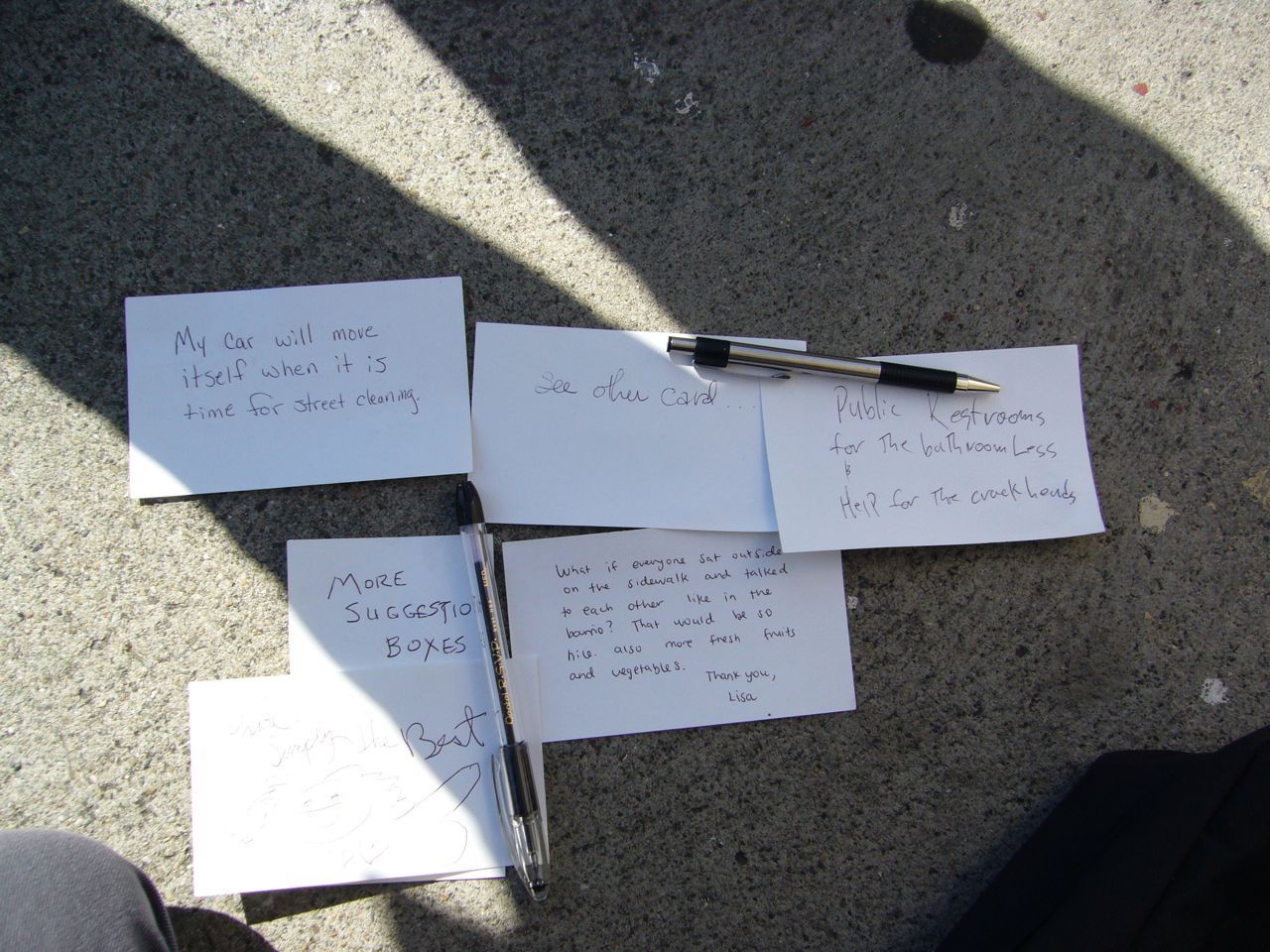 While The Waller and Steiner Suggestions Box is designed to be a tool for individuals and groups to express their concerns and aspirations, it also serves as a platform to discuss neighborhood grievances. Approximately two weeks into the life span of the project, short comments began to appear on "public" suggestions ("right on!", "yes!"). This was a desired effect. Ultimately, the implementation of many of these suggestions can only move forward with the participation of a majority of community members.