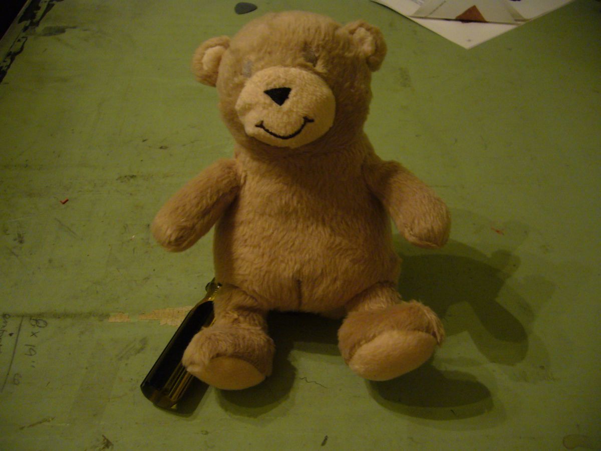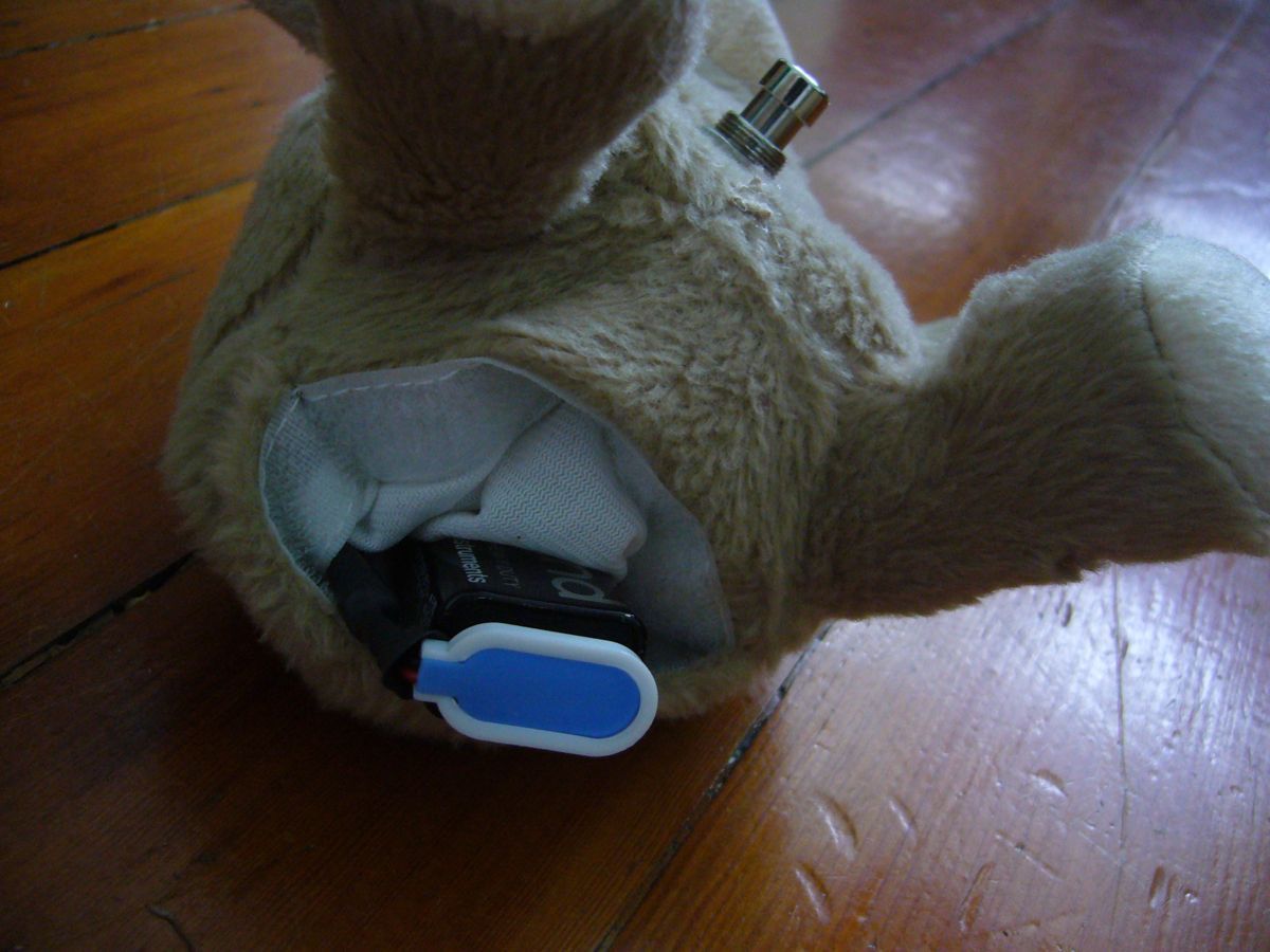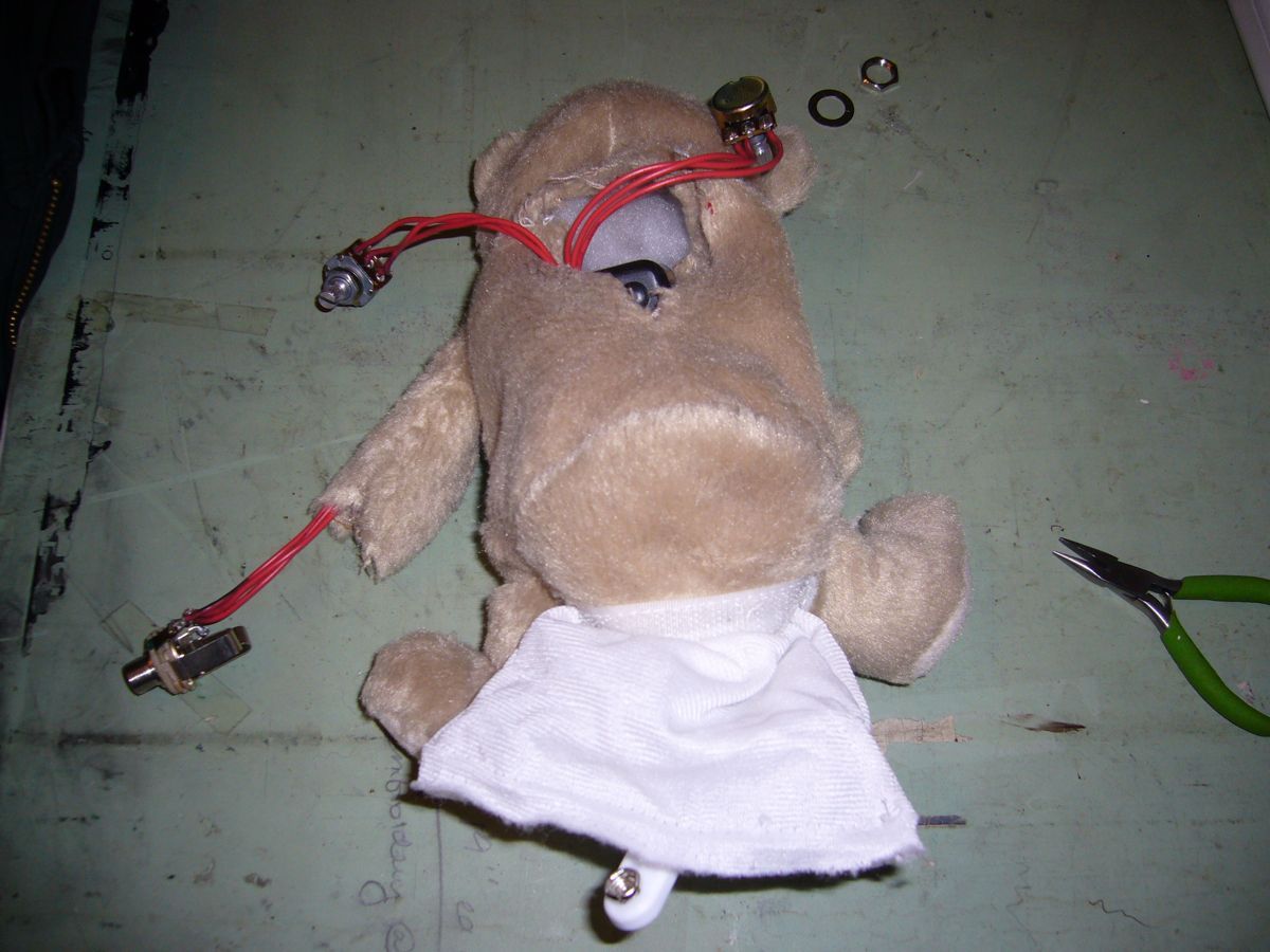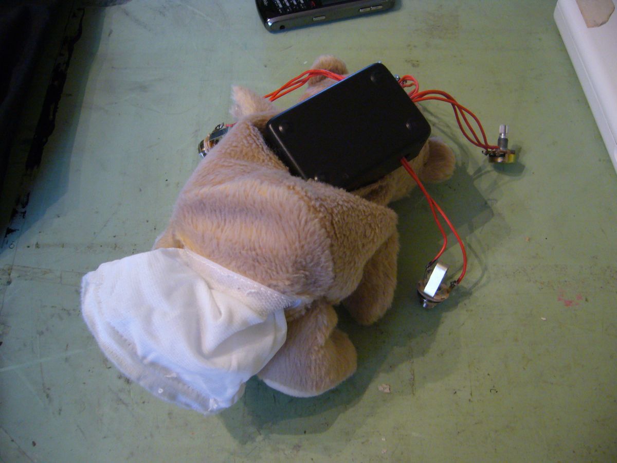Lara and I found the perfect bears at Walgreen's, which - as I had suspected - had marked down many a stuffed bear after Feb 14th. We bought this set of two, where when they touched noses (okay, "kissed"), one of them would emit a digitized kissing sound and start flapping its motorized cupid wings. I'm really sorry I didn't make a video of this, or even take any pictures of the pre-disassembly bears. For something like $5, I got two good-sized teddy bears, one of which already even had a battery pouch and a space for a box of electronics! The photos explain the construction pretty well, I think, so I'll leave it at that.