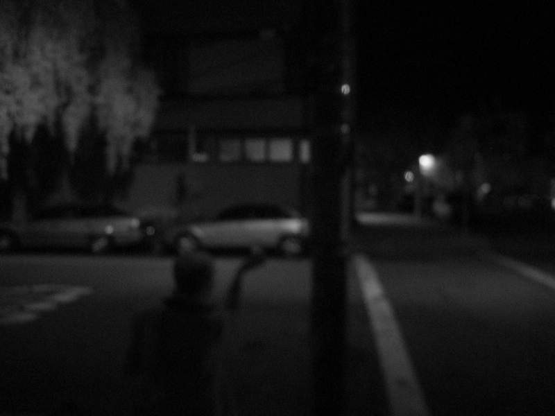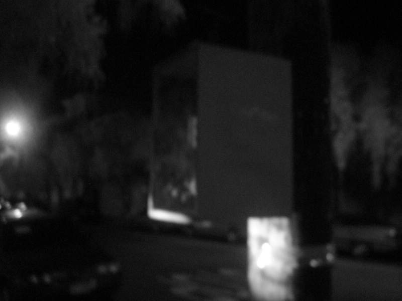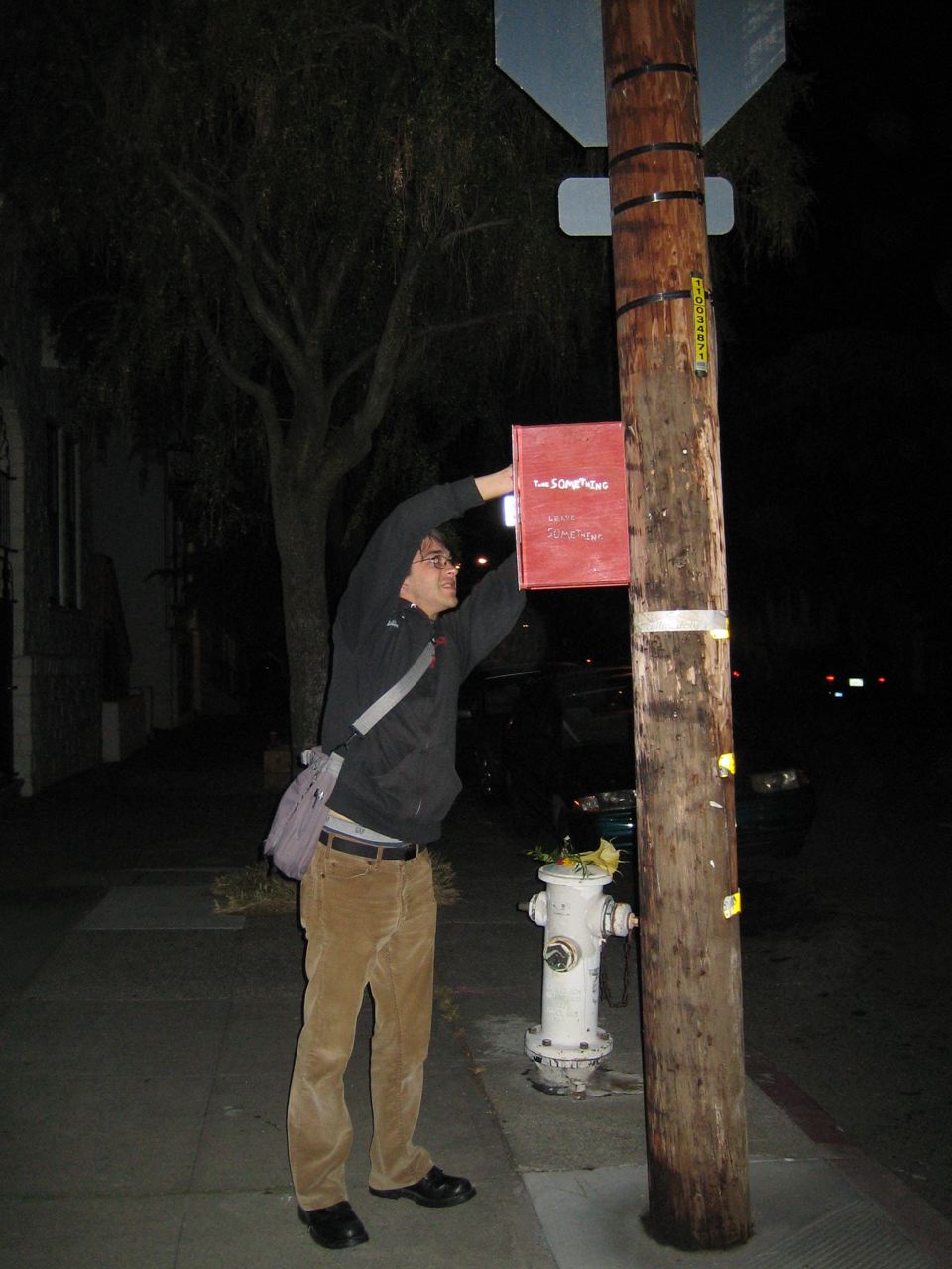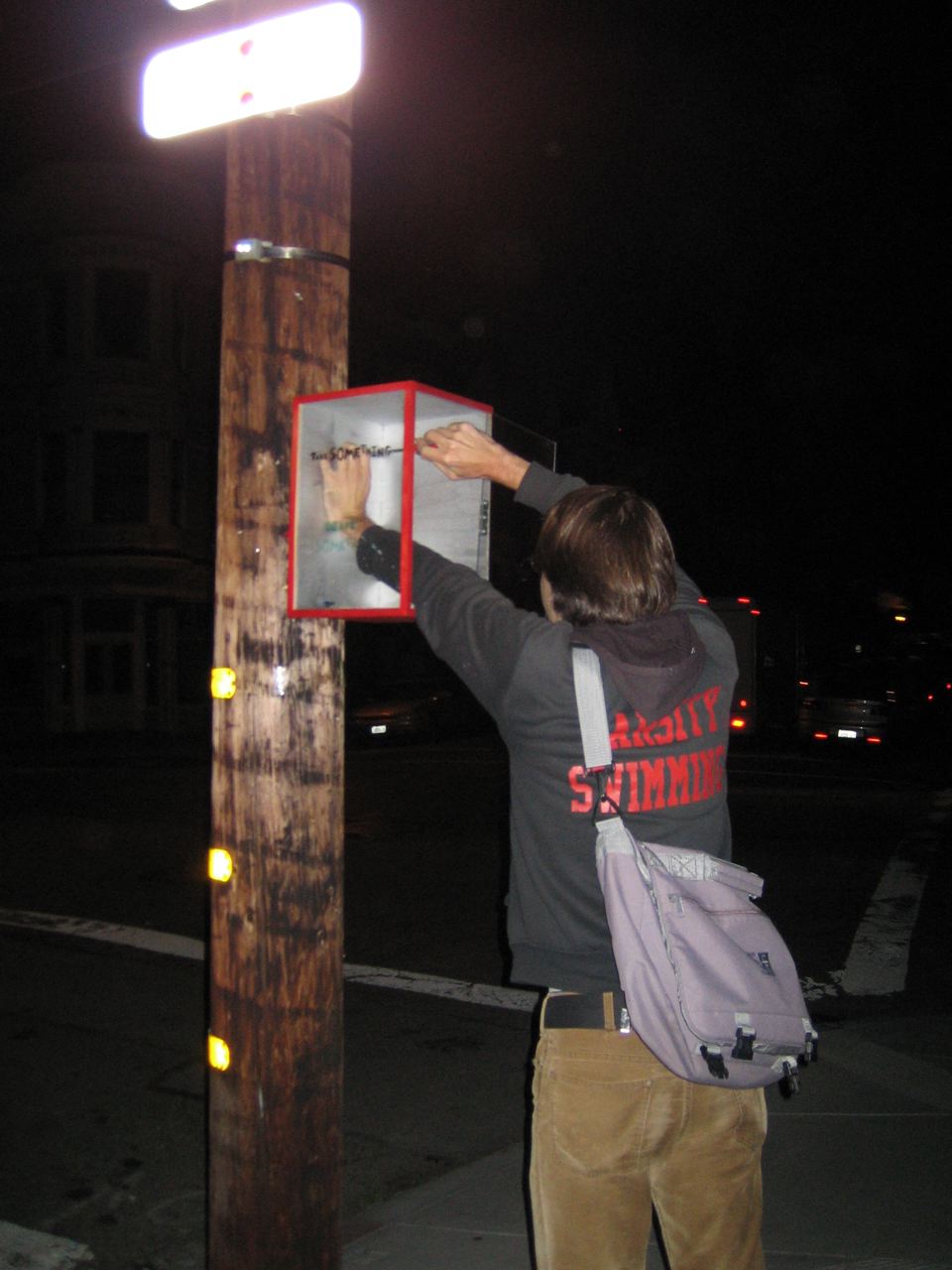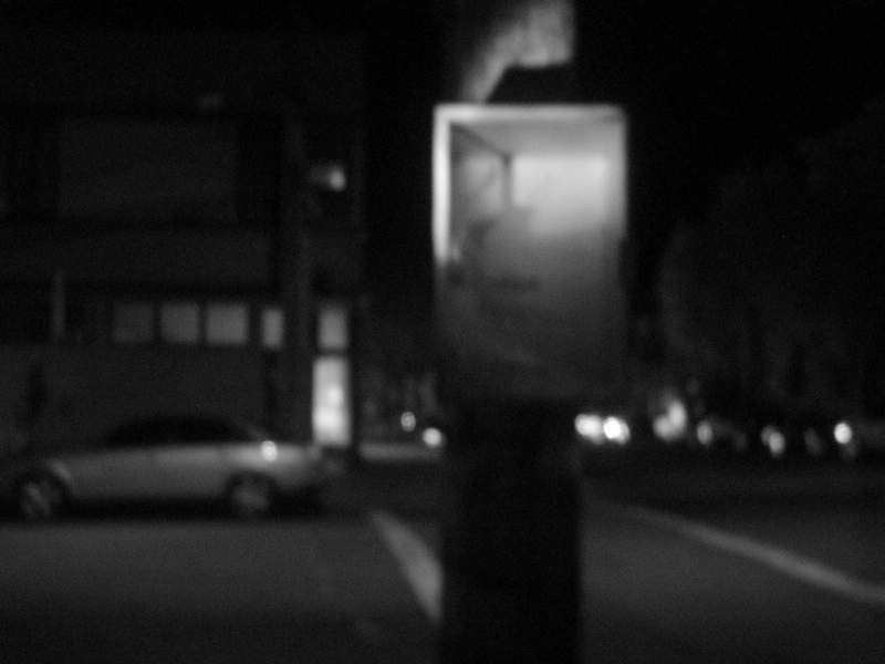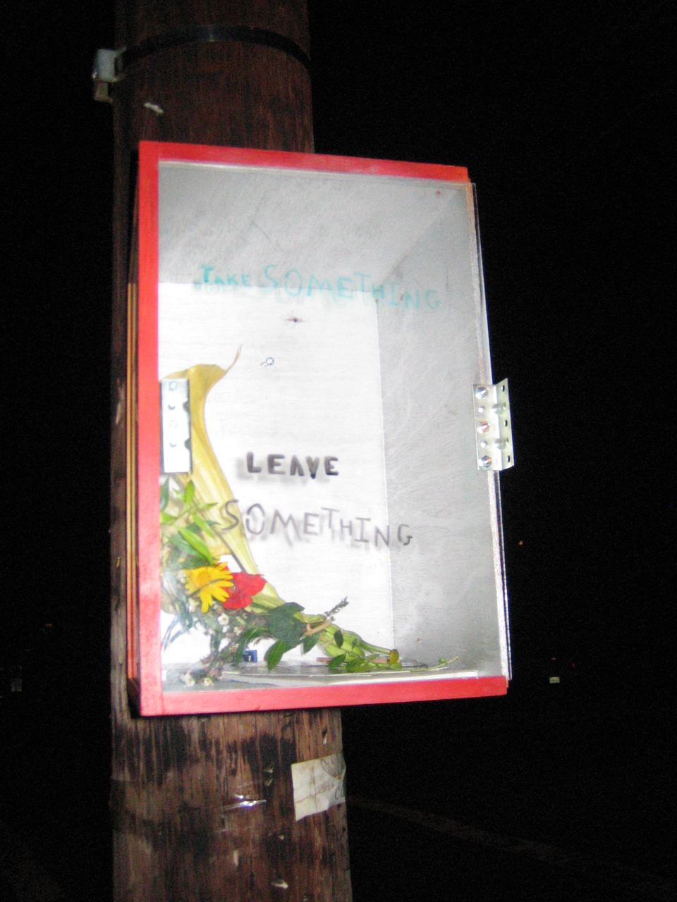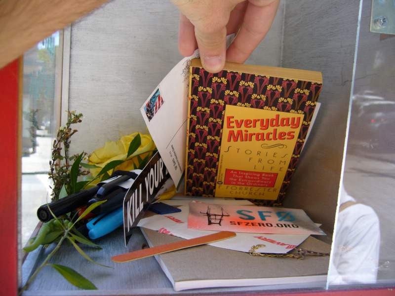 I got a box - about 12"x20"x12", and with two plexiglass sides - from a garage sale for a couple bucks. Seemed like it was meant for displaying a signed football or something like that. Anyway, I painted it, screwed on some metal brackets I had lying around (to keep the door from falling out), and we stenciled "Take Something / Leave Something" on it. Hopefully, it'll be put to good and servicable use. We left a couple stenciled SF0 stickers, some SF0 postcards (pre-addressed and stamped), one of the "Kill Your Browser" stickers I got from Slim a while back, a notepad, a pen, and a bunch of flowers. It's at Steiner and Waller, across Steiner from the "Bean There" cafe, screwed into a streetlight/electrical post. The blurry B&W photos were taken with the modified camera, which apparently hasn't gotten any better at focusing during a month or two of disuse.