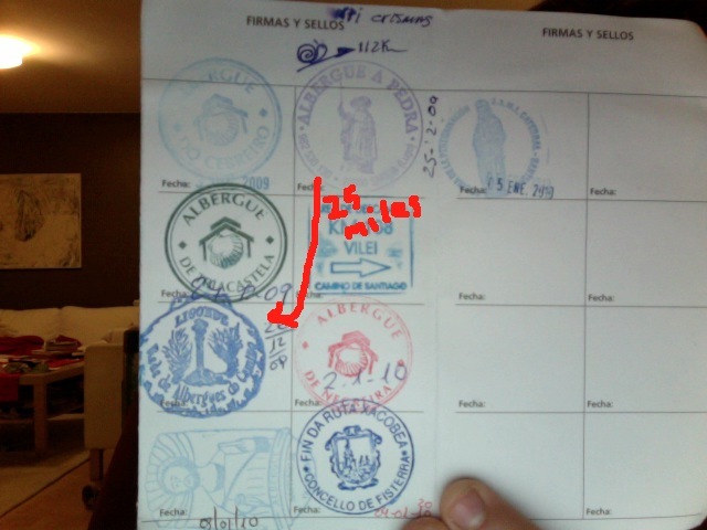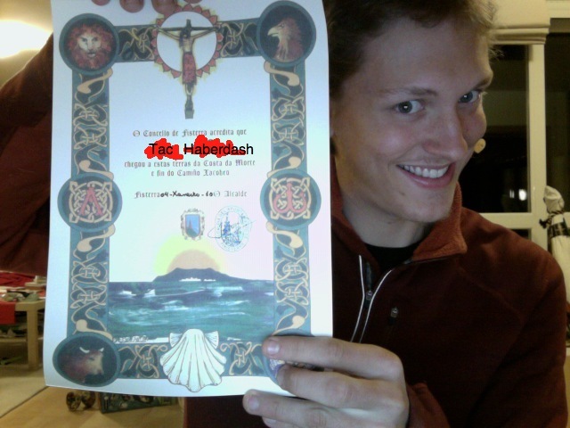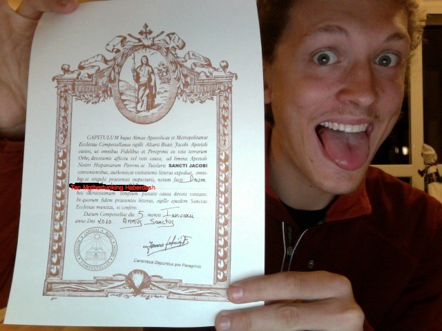 This is the document awarded upon arrival in Santiago de Compostela. I was horrendously exhausted the first time I arrived in the city, and didn´t go get it. When I returned, after going to Finesterra, I ended up having to argue with the clerks for about 20 minutes before they would let me have the thing, because the stamps in my credencial were all out of order.