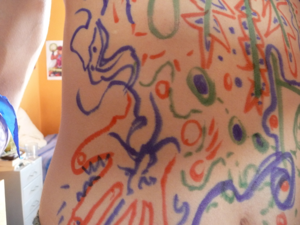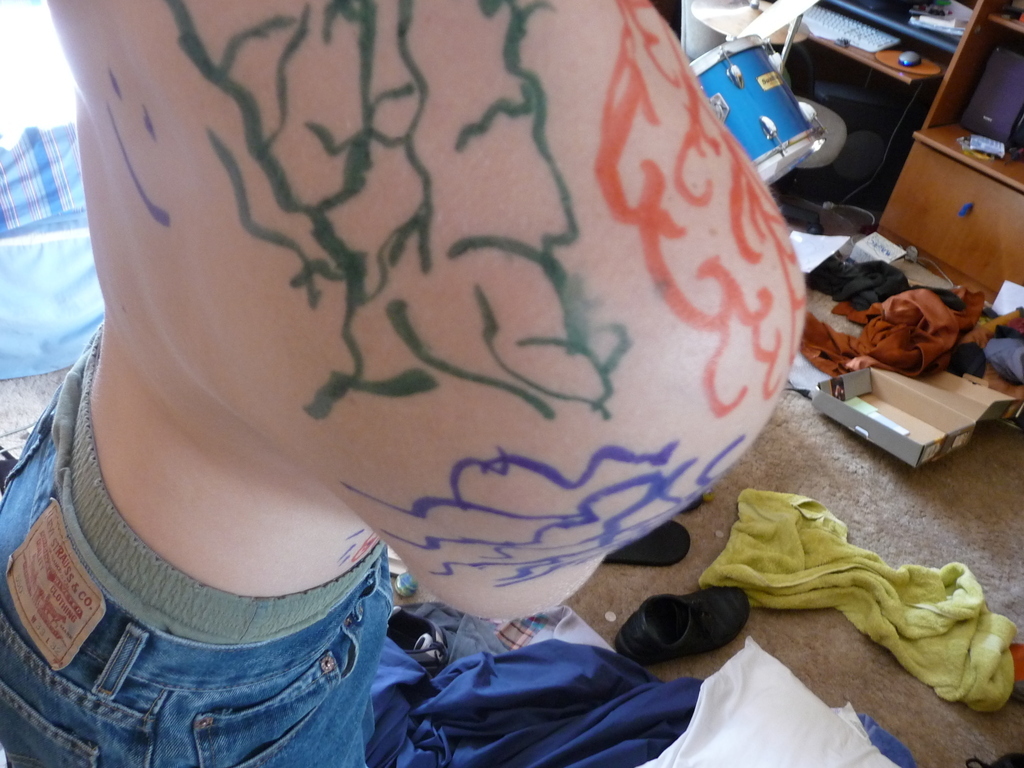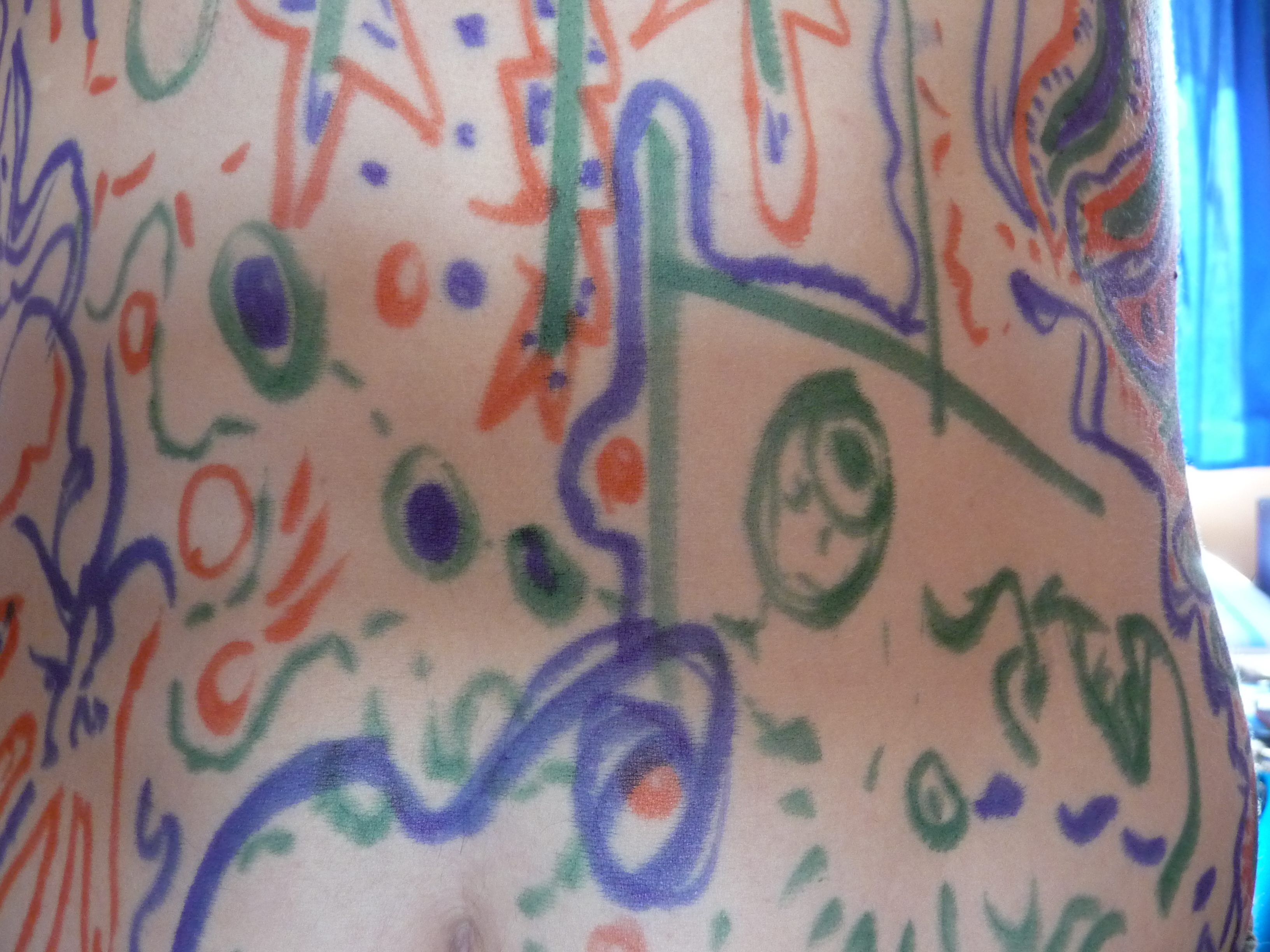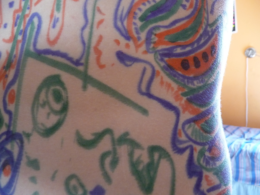 Creeping. A green arrow slowly formed itself on my stomach, drawn by a green sharpie clenched tightly in my left hand. Always the rebellious one, my left hand had taken it into its knuckles to claim the rest of my body in its name. Pale, defenseless flesh fell before it's tri-colored attack. Soon the abdomen was slathered in ink, and the rest of the torso was threatened with the same fate.