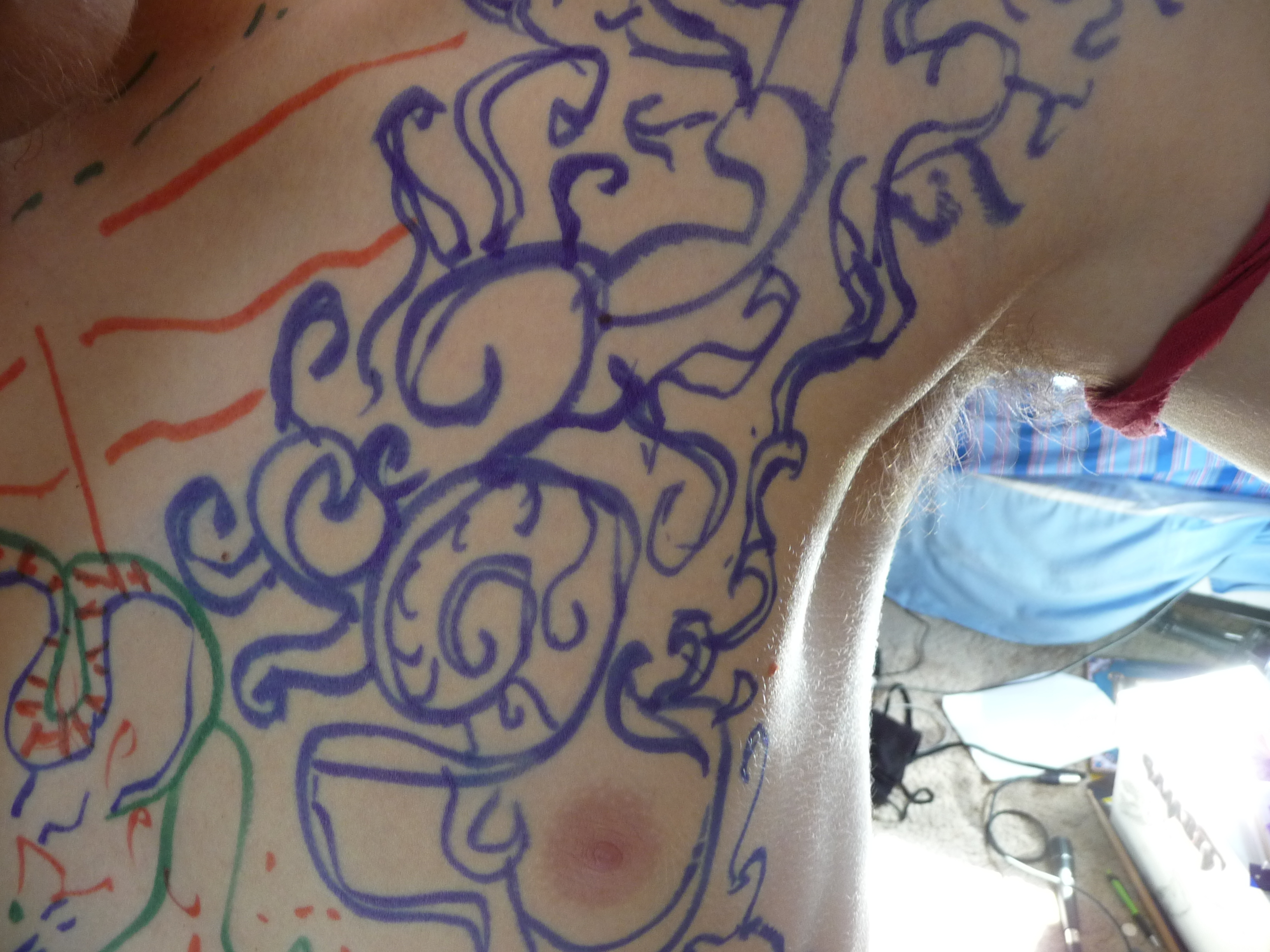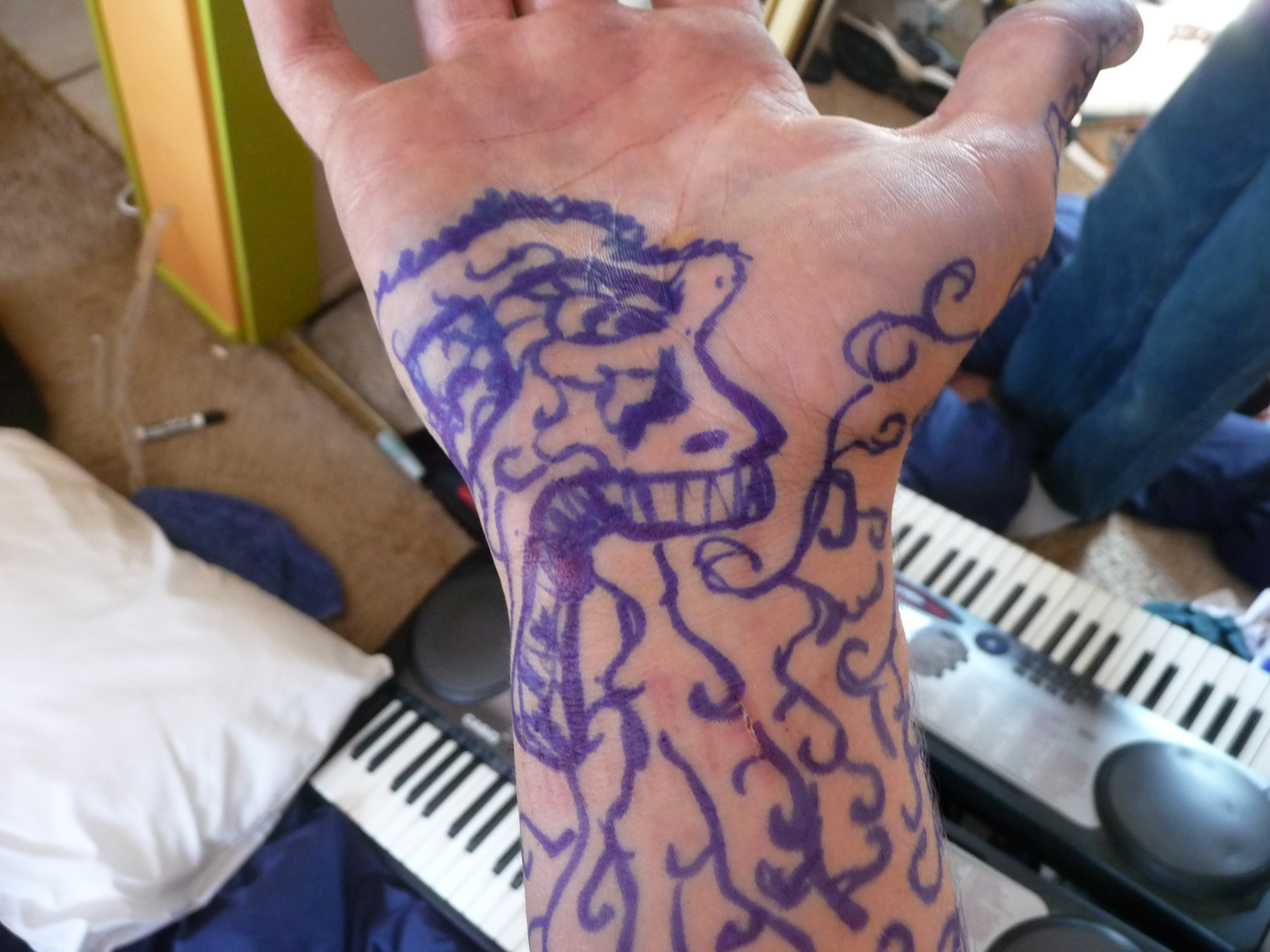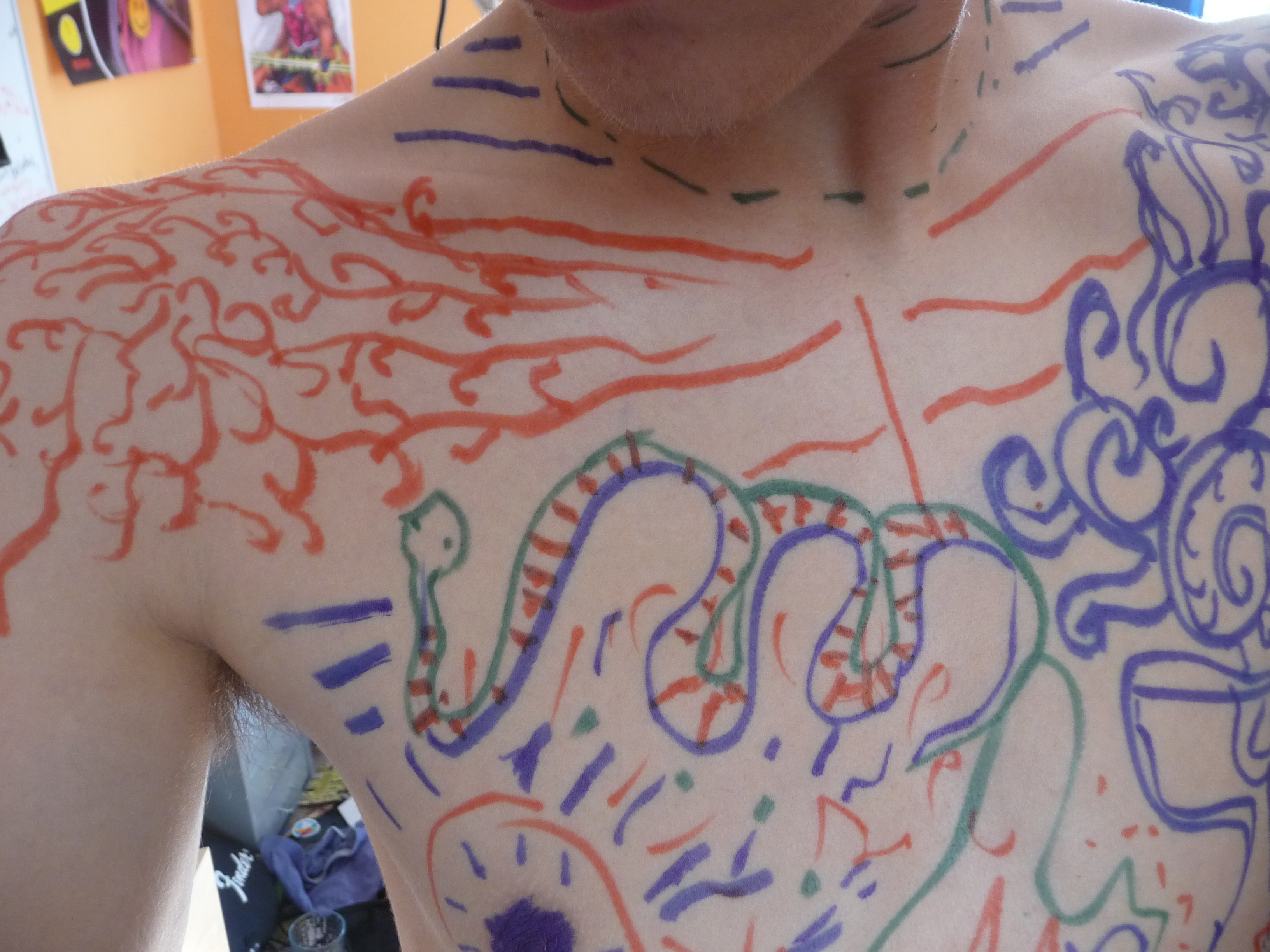 Creeping. A green arrow slowly formed itself on my stomach, drawn by a green sharpie clenched tightly in my left hand. Always the rebellious one, my left hand had taken it into its knuckles to claim the rest of my body in its name. Pale, defenseless flesh fell before it's tri-colored attack. Soon the abdomen was slathered in ink, and the rest of the torso was threatened with the same fate.