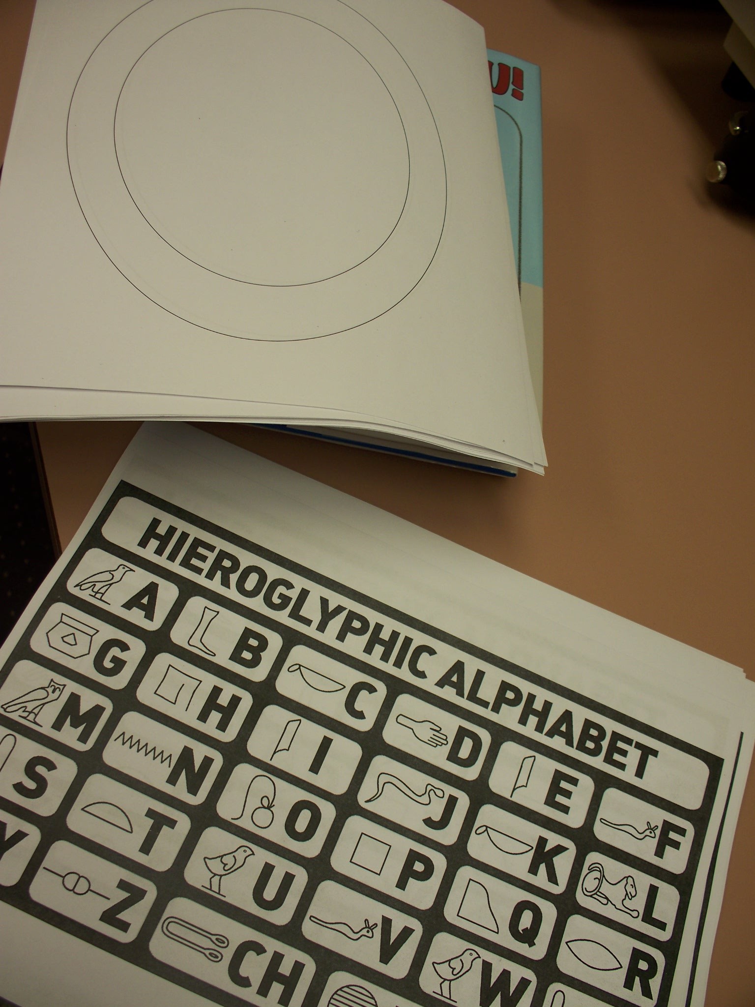 I found a hieroglyphic alphabet and a blank cartouche sheet from various educational sites on the Internet. These would be perfect for my display.