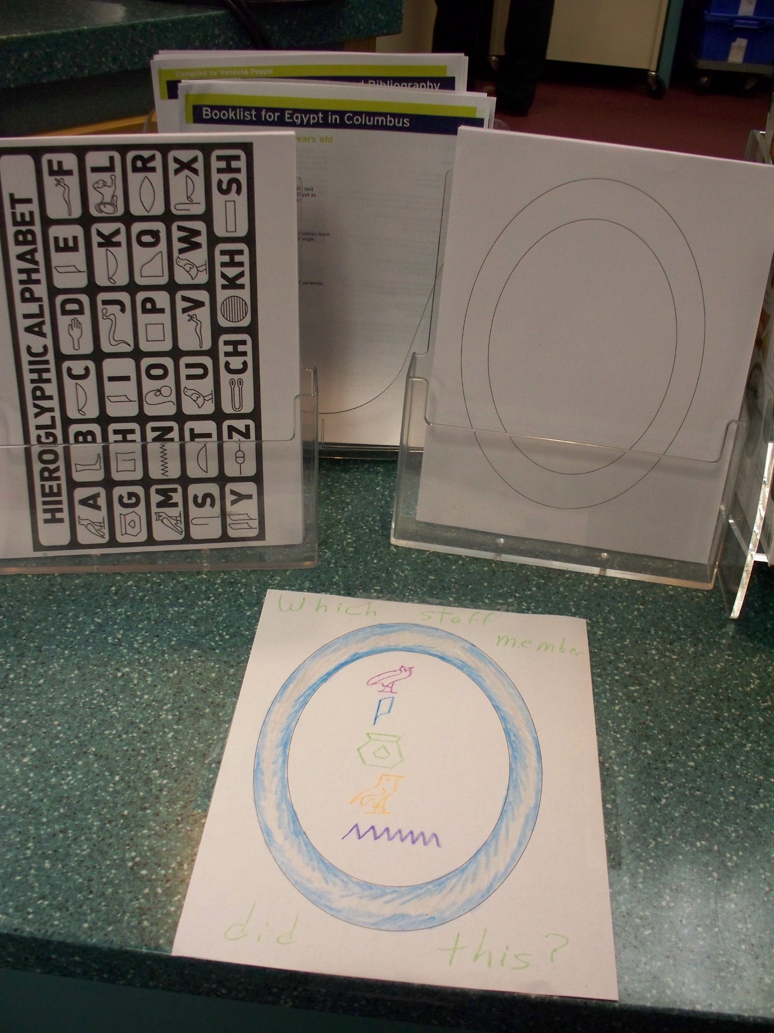 After a lot of moving things around (we have very little display space in our branch!) I was able to fit everything I wanted on our one little counter. It's often a little difficult to get our patrons involved in things, so I was pleased to see two people checking out the display and grabbing sheets within the first half hour after it was up. One of our patrons, who is often pretty taciturn, came up to the desk, grinned at me, pointed at the display and said "So you did that, eh?" She was so proud that she had figured out the hieroglyphics - and later I saw her fold up a sheet to take home with her. Display victory!