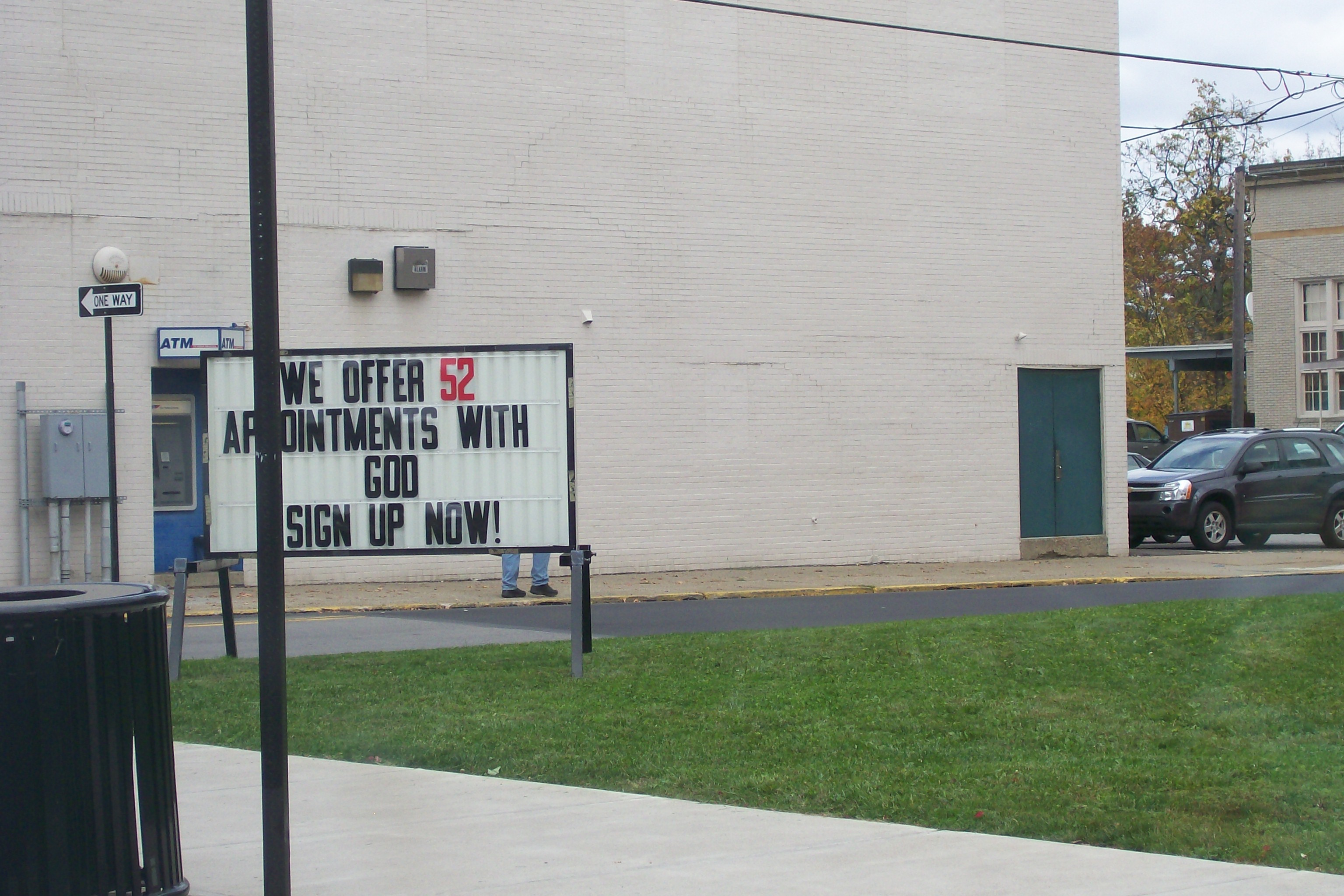 After lunch we went into town and drove past a church my sister used to go to, which usually has pretty good signs. My husband made me take pictures.