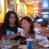 my friend and i swapping burritos today. this took place in burritoville in chelsea, new york city. she loved mine so much she took a few more bites too!