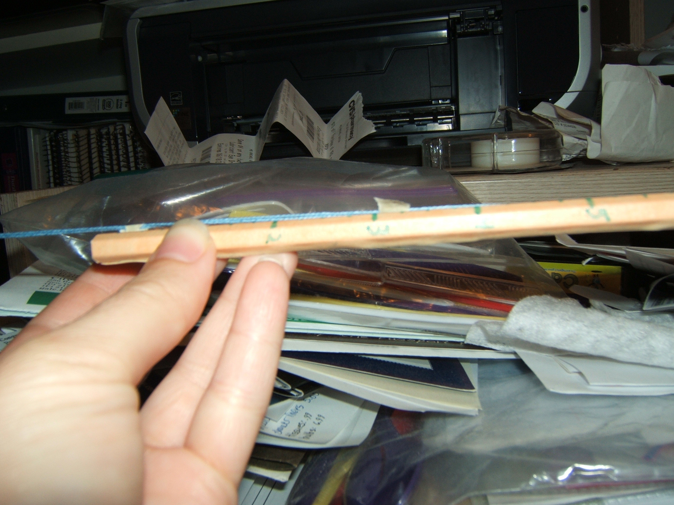 Once the chart was ready, I set out to make my grid on the desk itself. I bgan with the keyboard shelf, and taped a pencil to each front corner. Between the pencils, I hung a string.