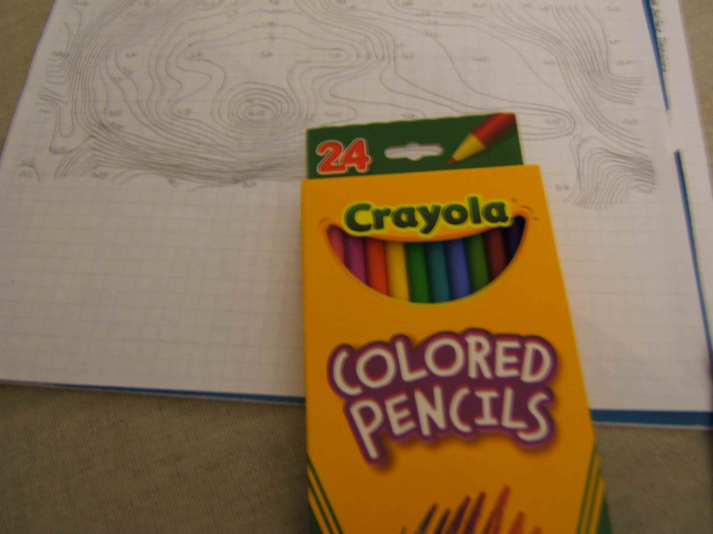 Then, I decided some color might help, so I assigned each whole inch a different color, with the highest point in yellow and the lowest in violet. I used colored pencils to color it in.