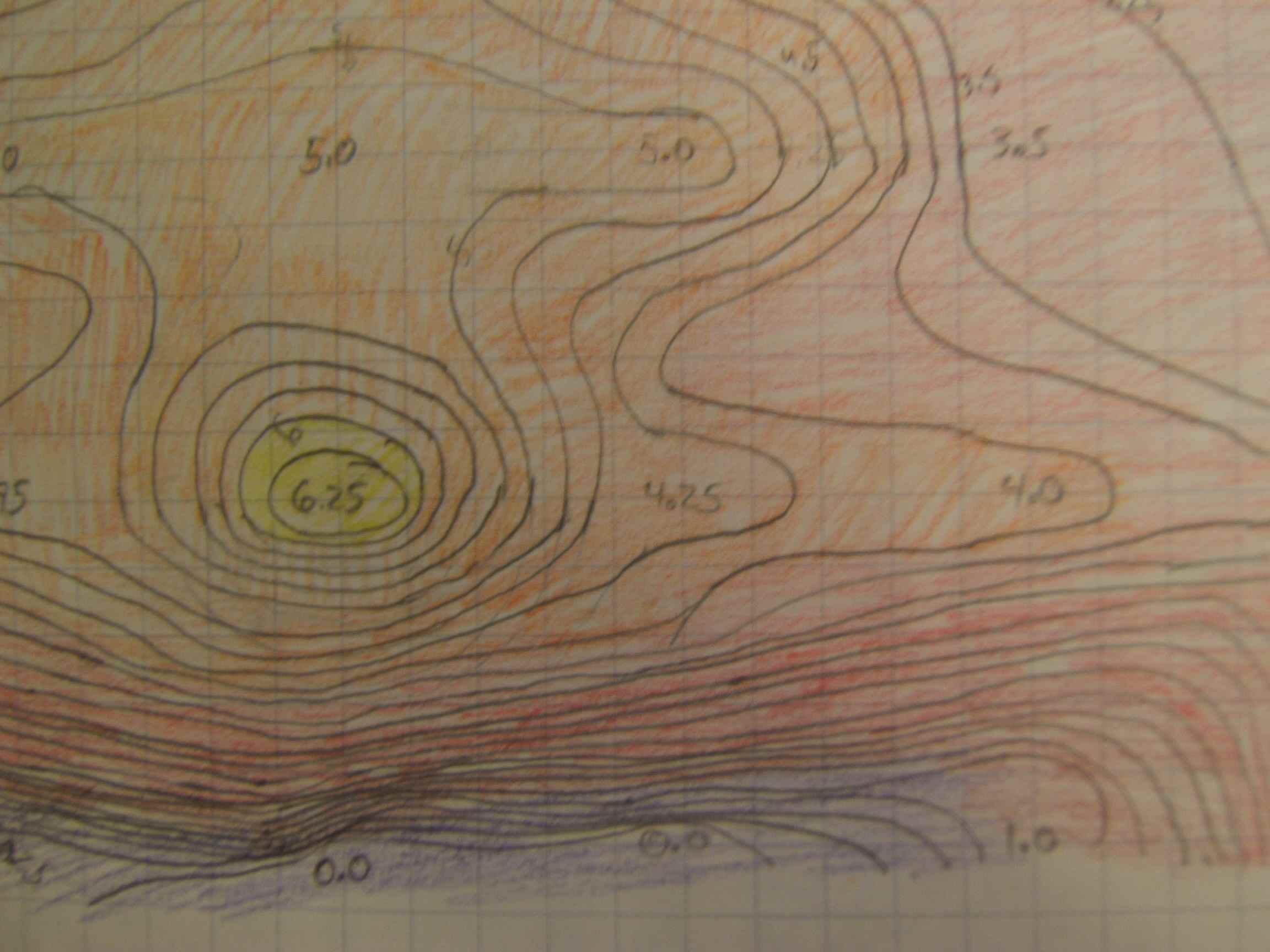 As I was preparing to work on another praxis (you will see it when it is done), I realized that a topographical map for my location of focus might be useful. As such, I gathered my supplies, and ventured out into an area that is truly mine, and chose a location that is known for its uneven, highly volatile topography. I knew that I would need to complete this task within a short window of time, because the topography of my area of focus is constantly changing, with frequent deposits of new material, and the unfortunate tendency toward avalanches.