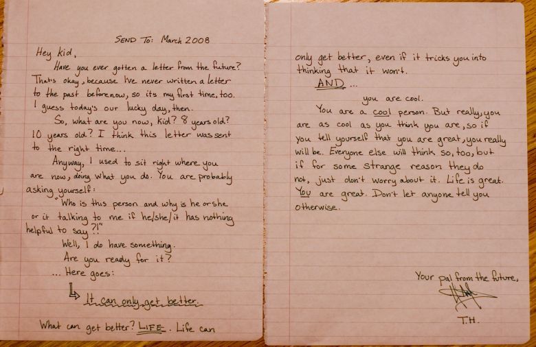 I decided to write this letter from MY present, TO my past, and I will leave the letter at the elementary school (my past) for some 8 year old to find (his/her present, my past). He'll read the letter (my present, his/her future) and hopefully be happier for it.