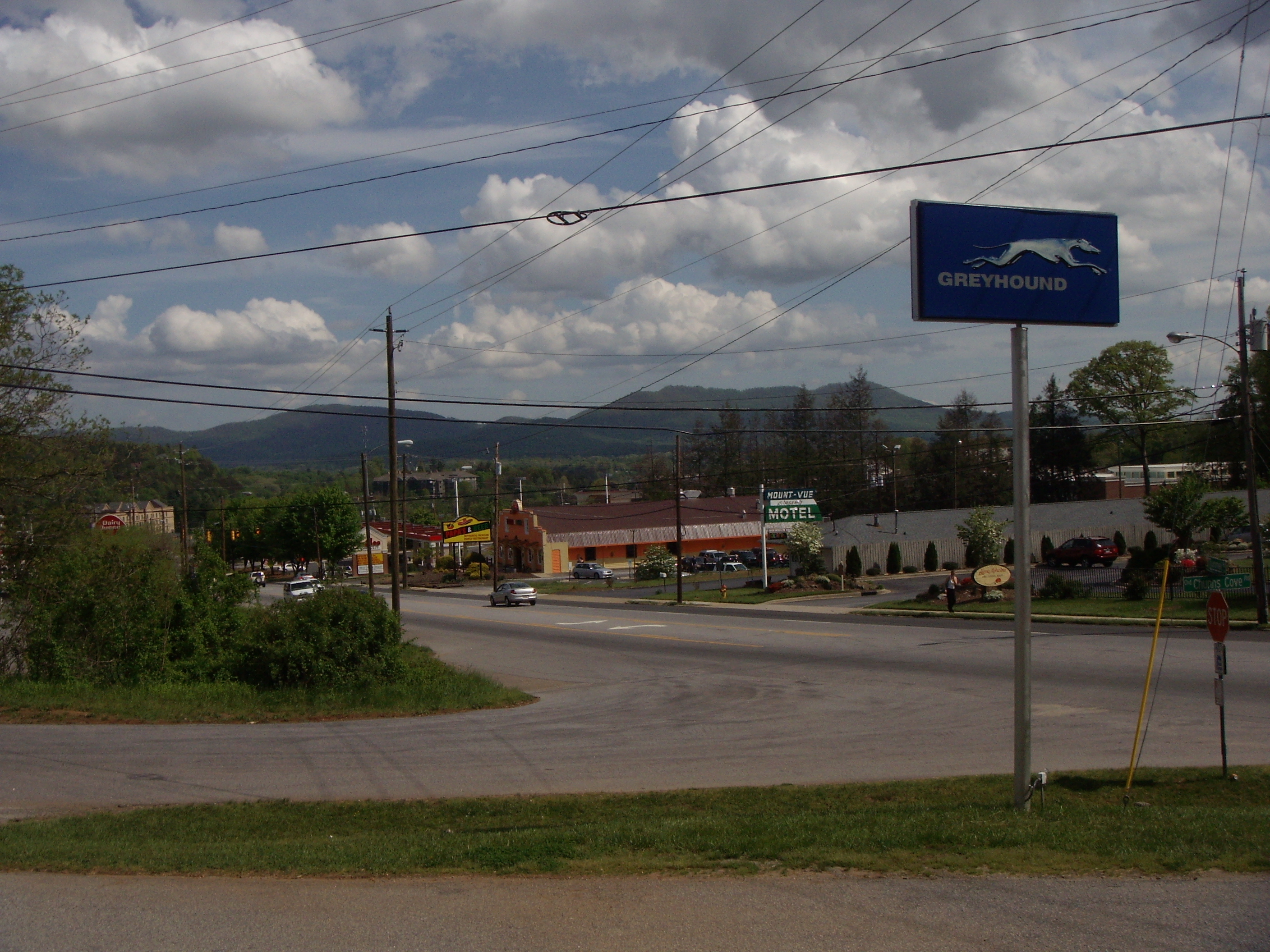 1605 EDT - Asheville! It's the virst stop far enough from home to feel special or scenic enough to merit a photo. I've also got a new seatmate. My old one got off in Winston-Salem, and I've been alone ever since; the new guy has stiff braided pigtails & a great moustache. The Asheville Greyhound station is tiny, being the first one not doubling as a local bus depot.