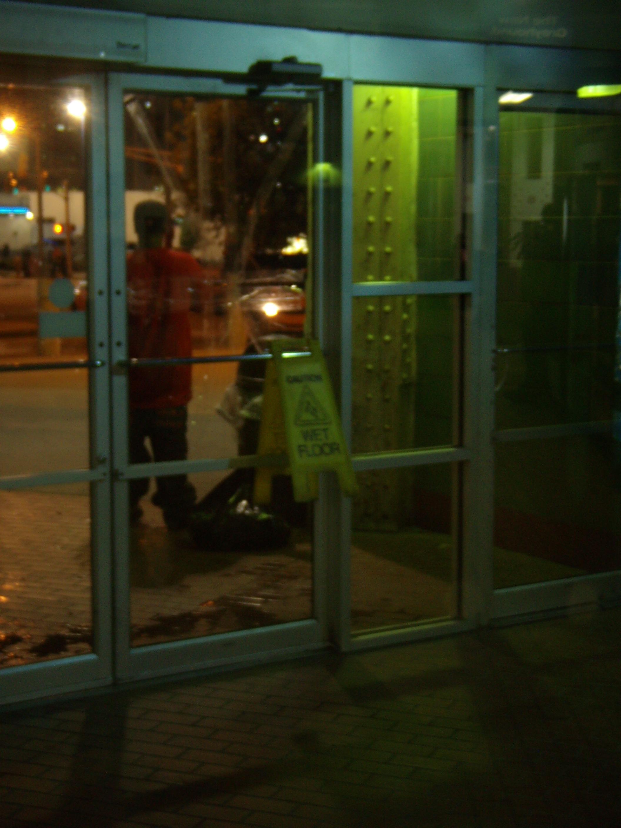 0256 CDT - A man asks if I'm taking a picture of him or something in a voice that implies that the answer had better be "no." It is, so I tell him honestly that I'm taking one of an oddly-placed wet floor sign. He smiles, says "Oh, right on!" gets back in the shot & goes back to smoking.