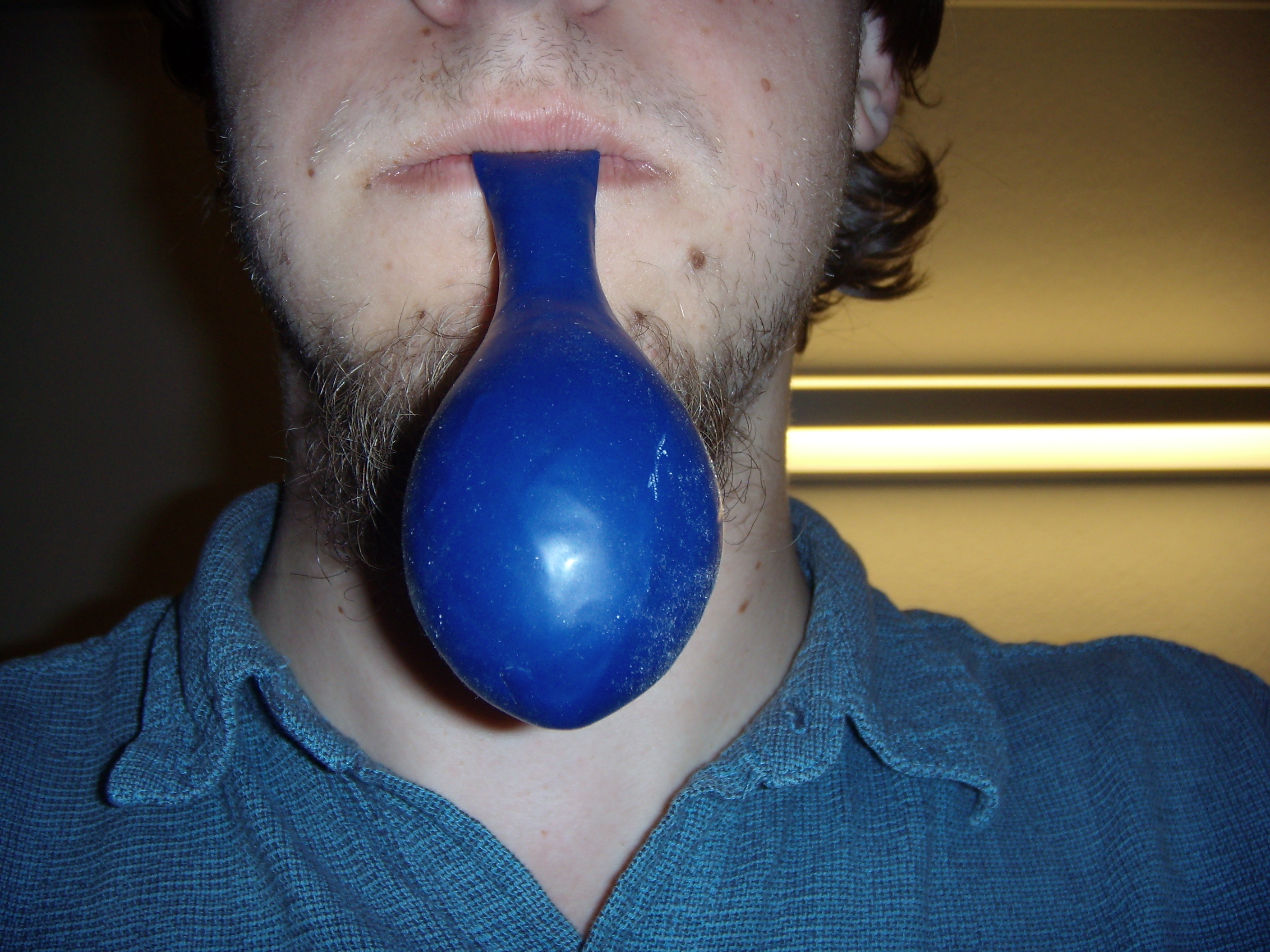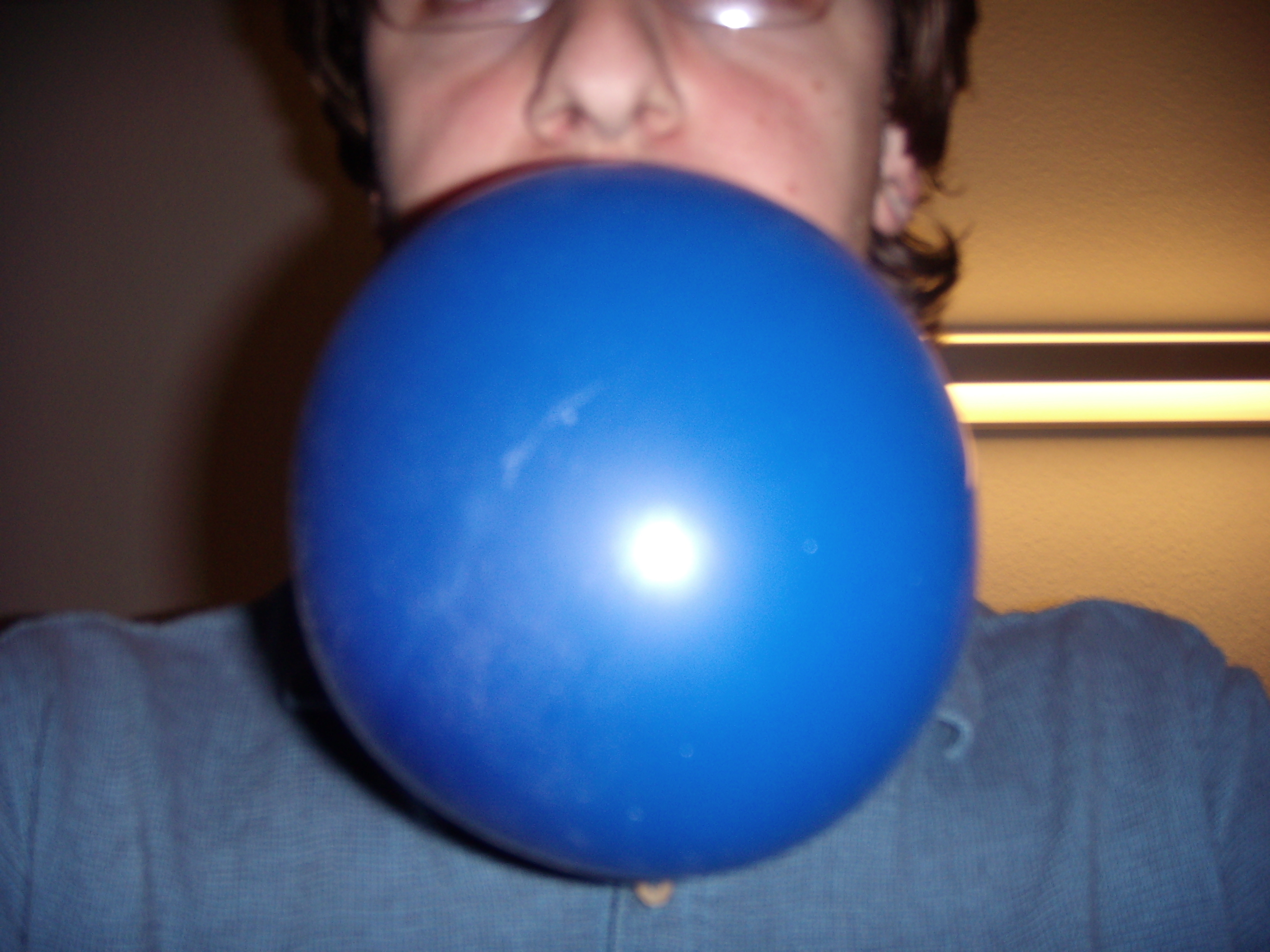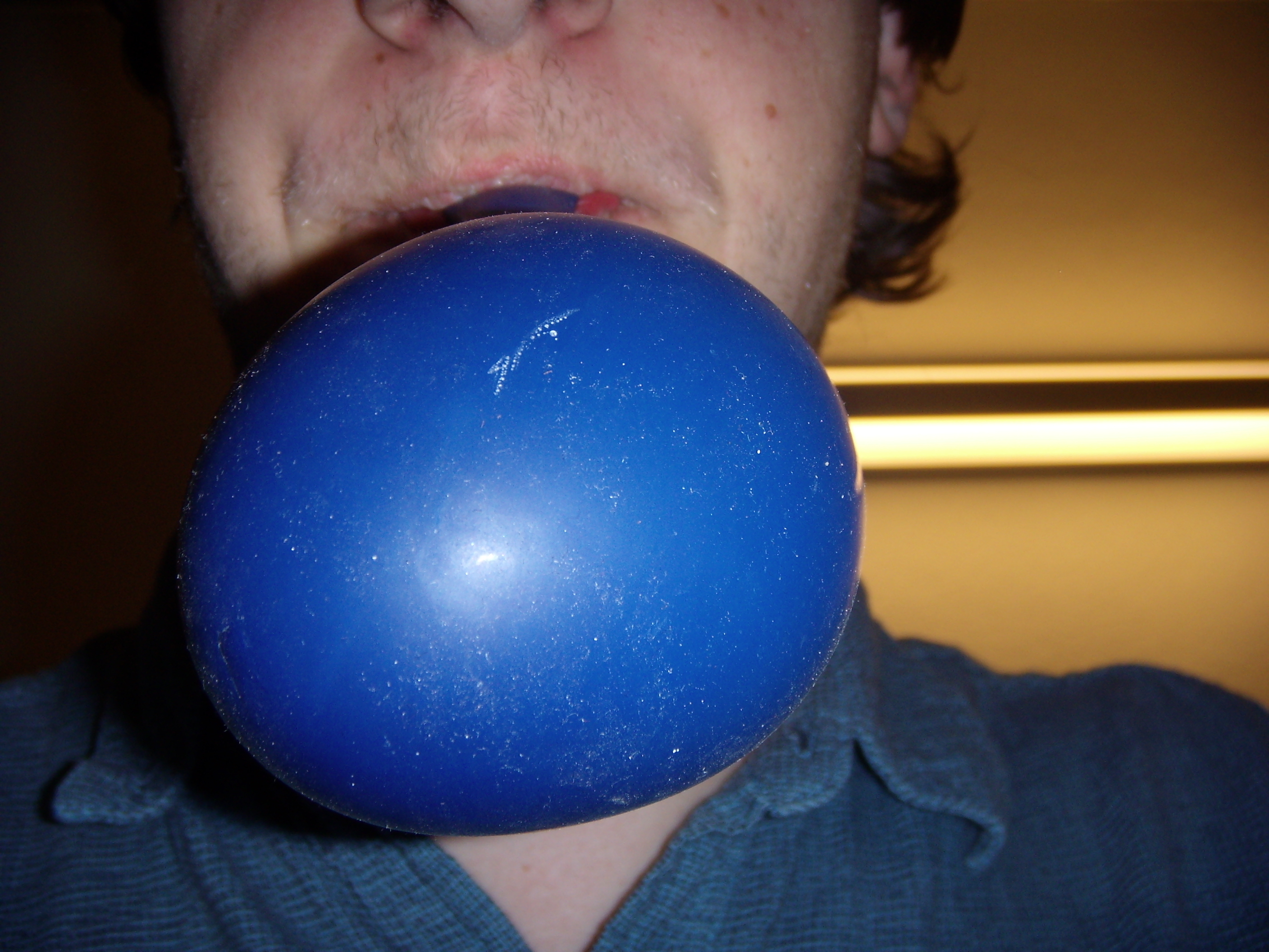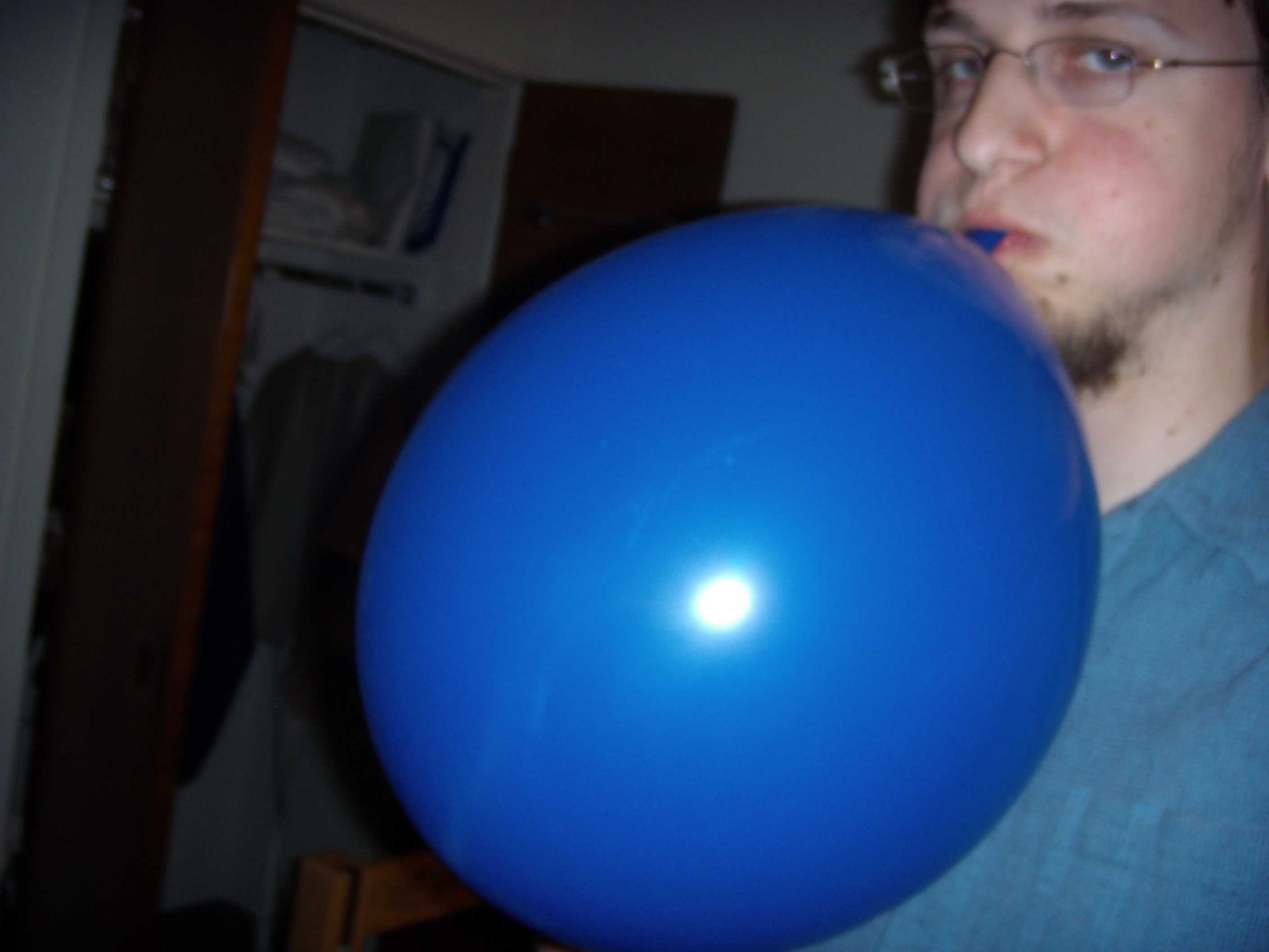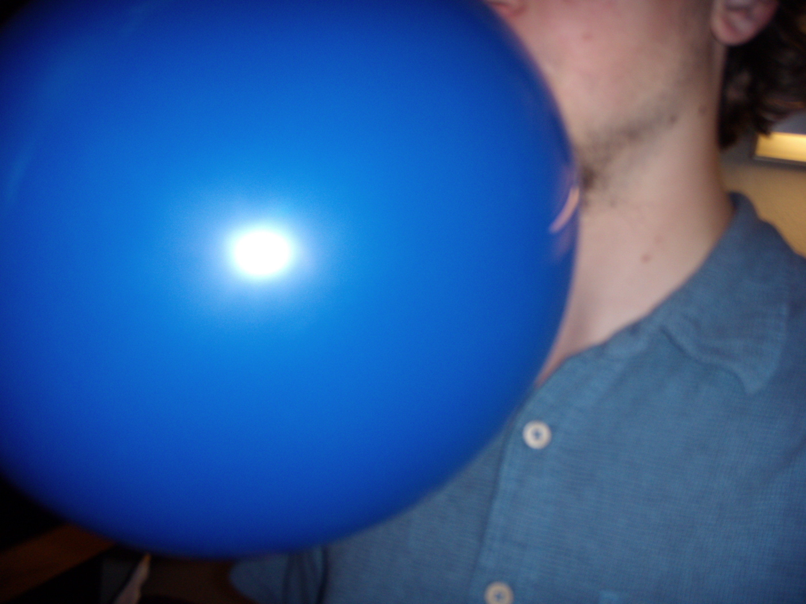 Photographer Peter Harmon evidently elected to portray his inflation efforts in profile so as to call attention to the disparity between the natural growth of his sideburns, which he has neglected to shave for several days, and the growth he himself has compelled the balloon to exhibit.