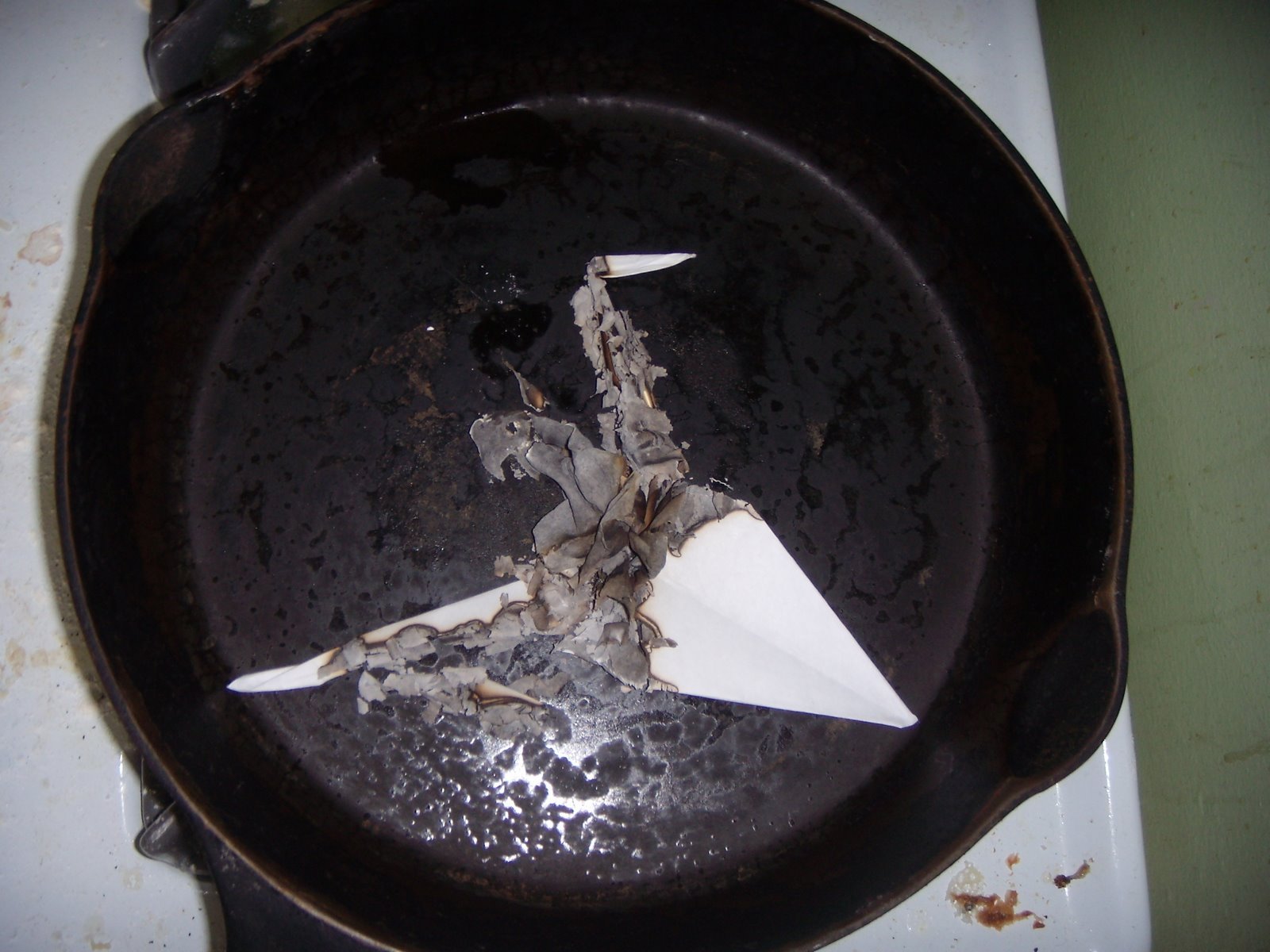 One of the questions asks you to make and then burn a paper crane. I burned mine in a cast iron skillet.