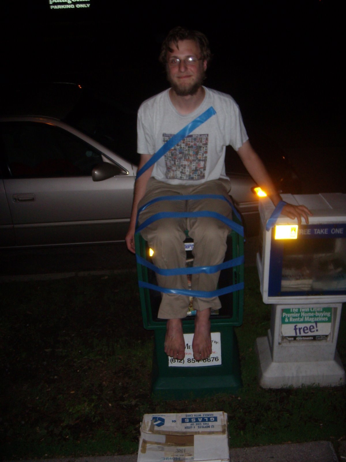 The newspaper dispenser picture was taken by a friend. I taped myself in, she took a picture, then she taped my hands down (without being asked, though without objections from me) and took more pictures.