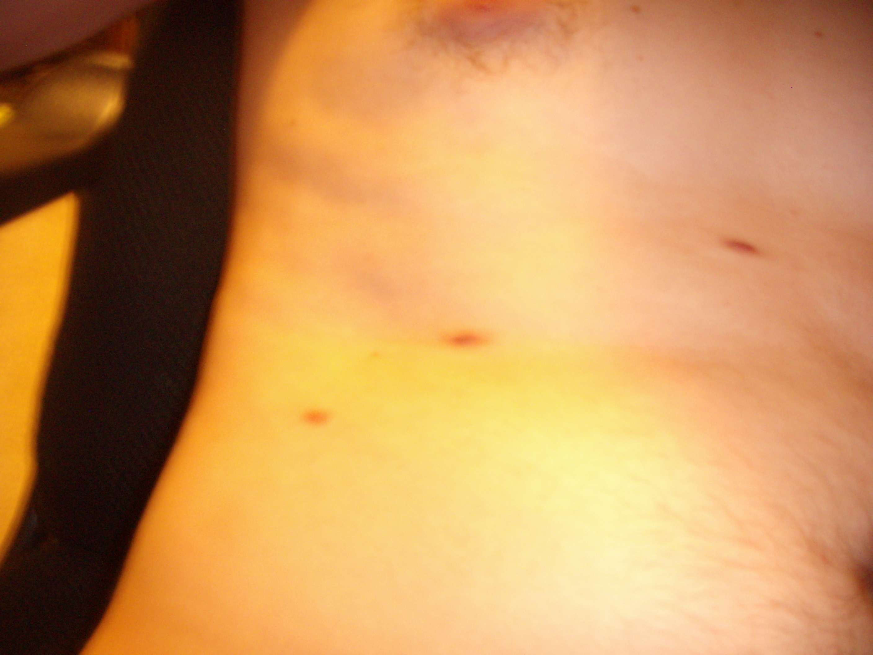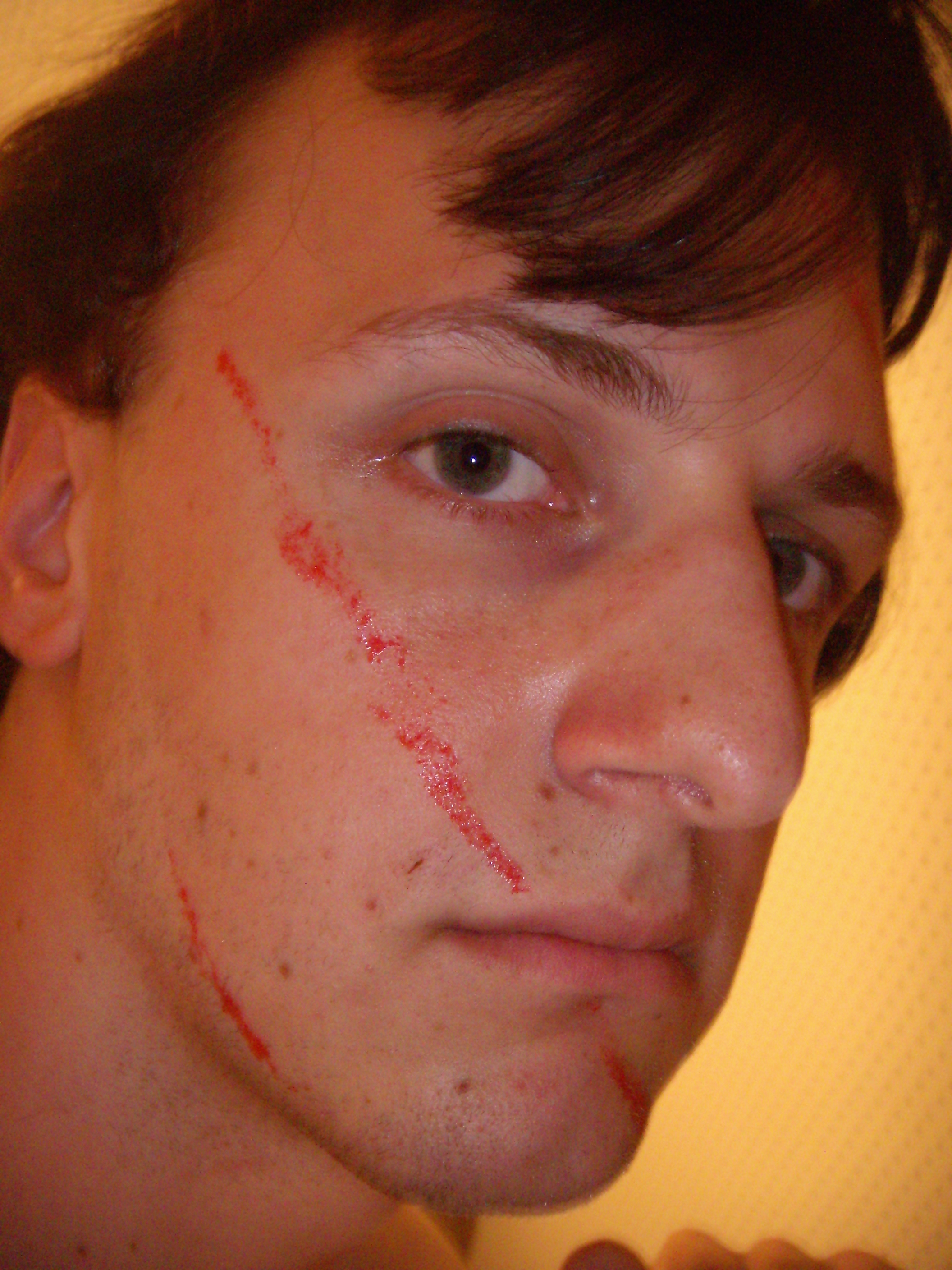 Demonstrating why isinglass doesn't work very well for fake scars. (Gelatin produces much better results.)