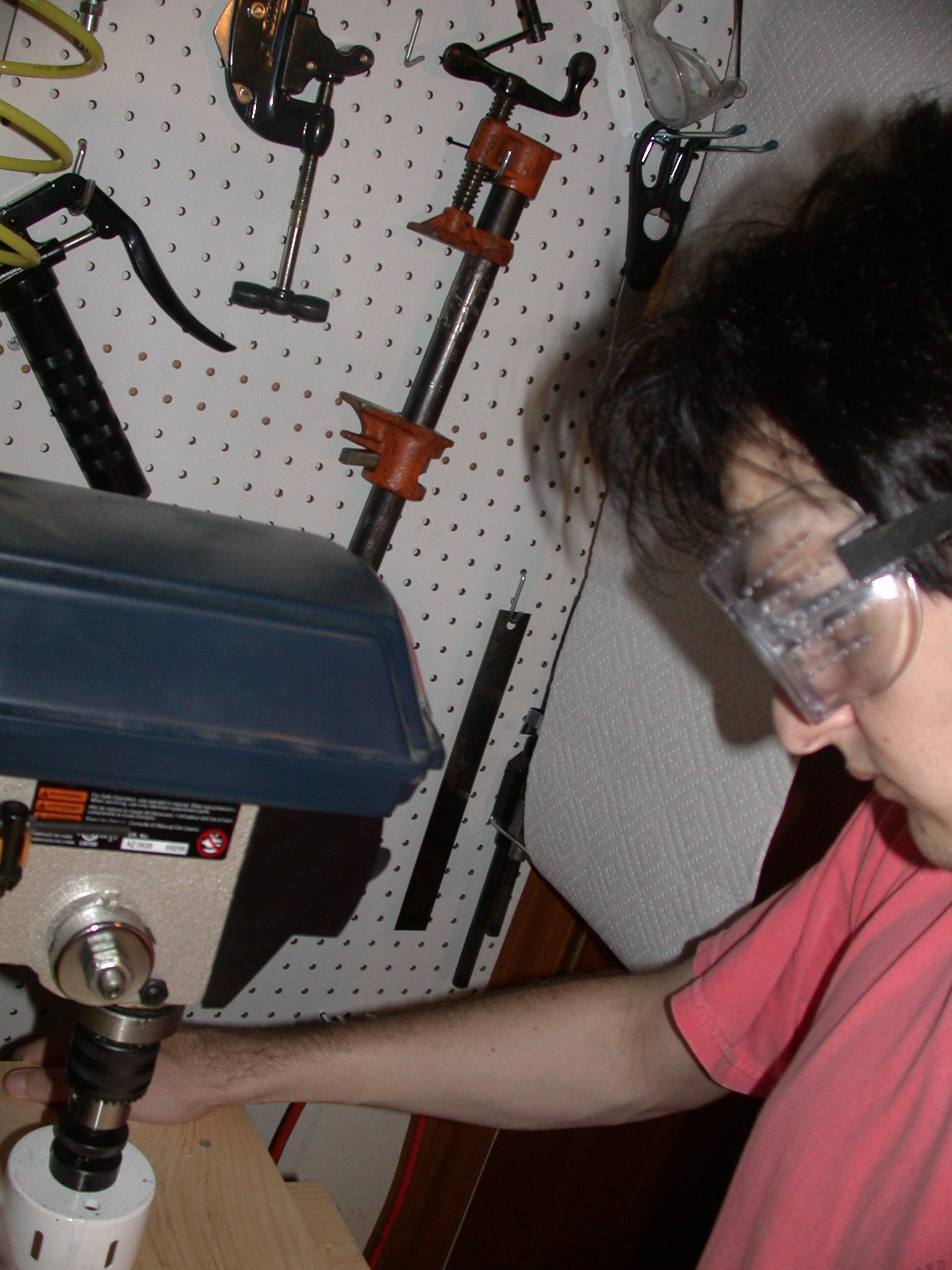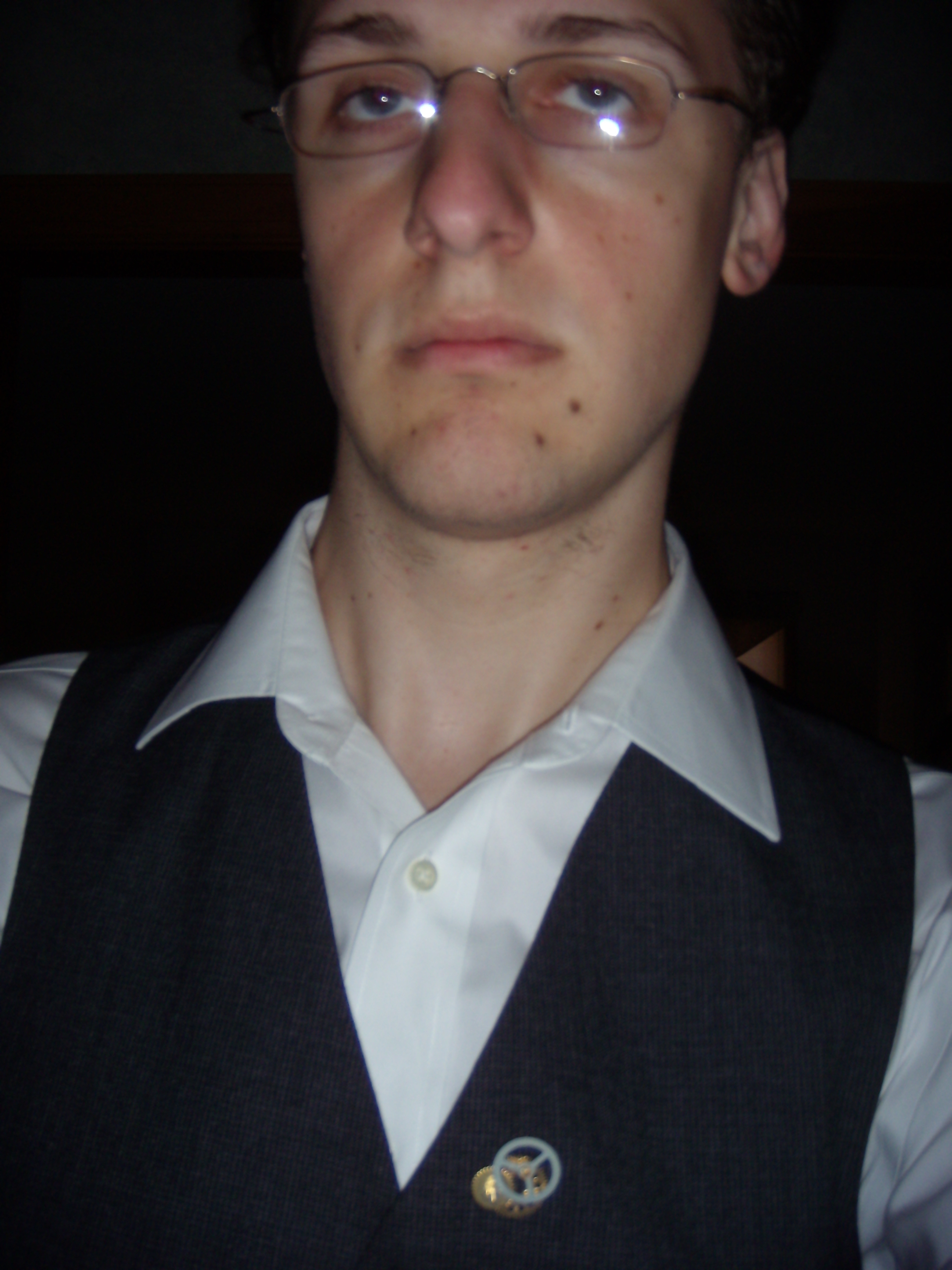 In this photo, I show off a lapel pin made of parts scavenged from a kitchen timer.