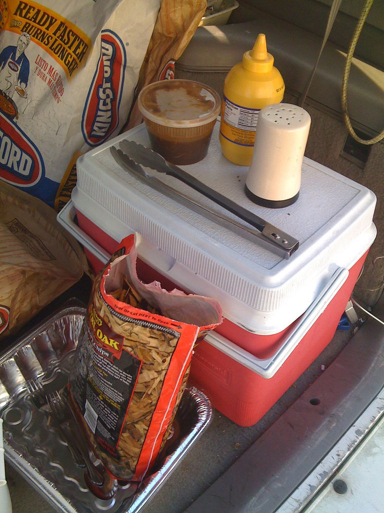 Here's the sauce and some mustard, along with the bag of woodchips used by Burn Unit to generate his smoke. Both of us used hickory. Hickory is much loved by traditionalists. Mesquite is fine, I suppose, but it's a different animal.