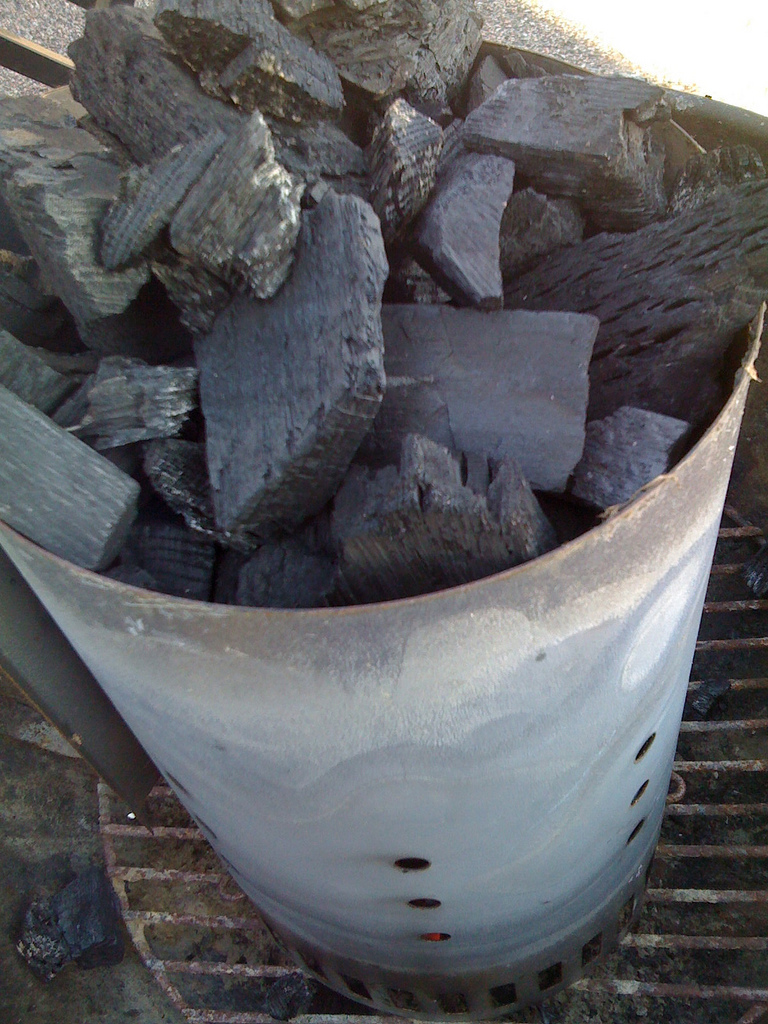 Burn Unit started with hardwood charcoal, but that was just to get the initial layer down. That fancy "charwood" stuff is Awesome, but I find it burns too hot and fast for this kind of cooking--either that or I just am a stick in the mud and like to layer on the kingsford as the day goes on.