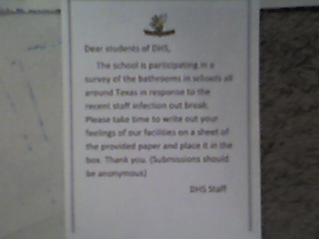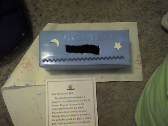 SO I did one to put in the guys bathroom, for suggestions about how to improve the schools cleanliness, I even made a DHS letter head with a note explaining that the suggestion bx was a way to help combat the staff out break, so tomorrow its getting planted in the bathroom