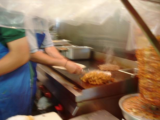 First, meat is grilled. Usually, its already been precooked, and only thrown on the "Plancha" momentarily to reheat and perhaps add a bit of flavor. As the meat is cooking, the tortilla is also thrown on, primarily to heat, but also to slightly moisten the tortilla, giving it a malleable quality which is necessary when wrapping it around many ingredients. Dry, half cooked flakey tortillas are not as easily swallowed, require a bit more lubrication (such as sour cream or guac), and a bit more chewing.