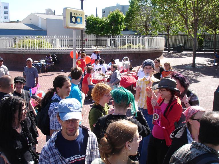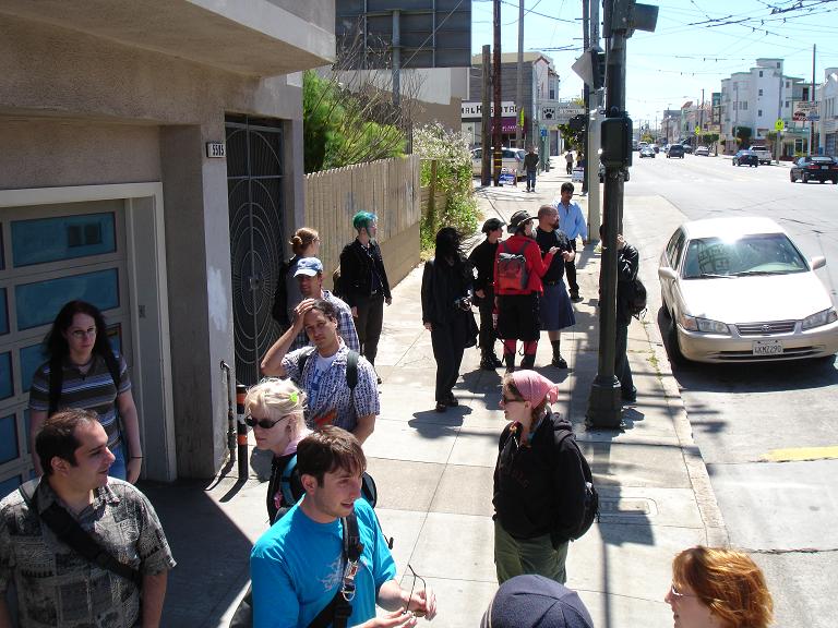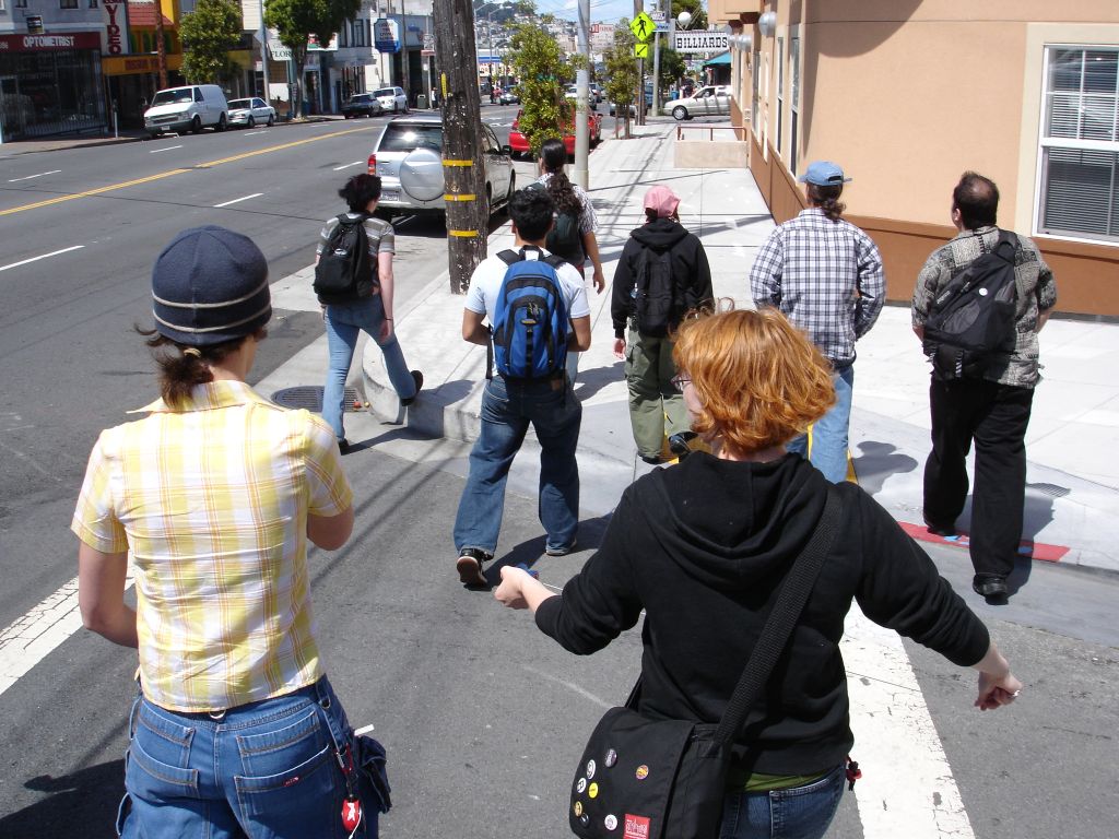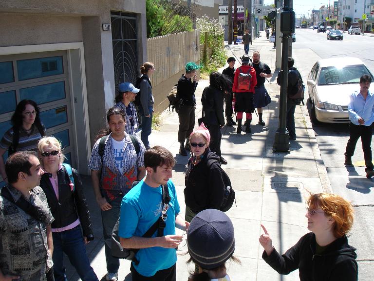 Meet at 2pm on Sunday, May 28th, at Mission and Wellington. Look for the bundle of brightly colored people nearby. You might want to wear a hat, and/or wear some sunscreen. Water's a good idea, too. And friends. Bring nice people, bring people who like to walk. Bring the sort of people who like to brag that they've got sore legs because they walked 7 and a half miles through San Francisco on memorial day weekend for no real reason at all, just to walk. Bring your camera, bring your duck-friend, bring your bad puns and your favorite chewing gum. Bring your sense of adventure, even.