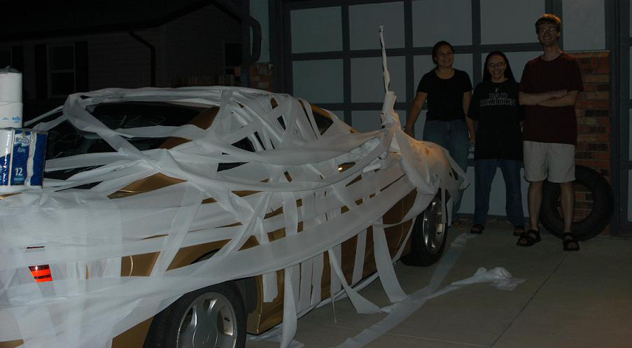 One of my favorite artistic media is toilet paper. I got a couple of friends to help me make this very boring Ford look more decorative and Charmin-soft.