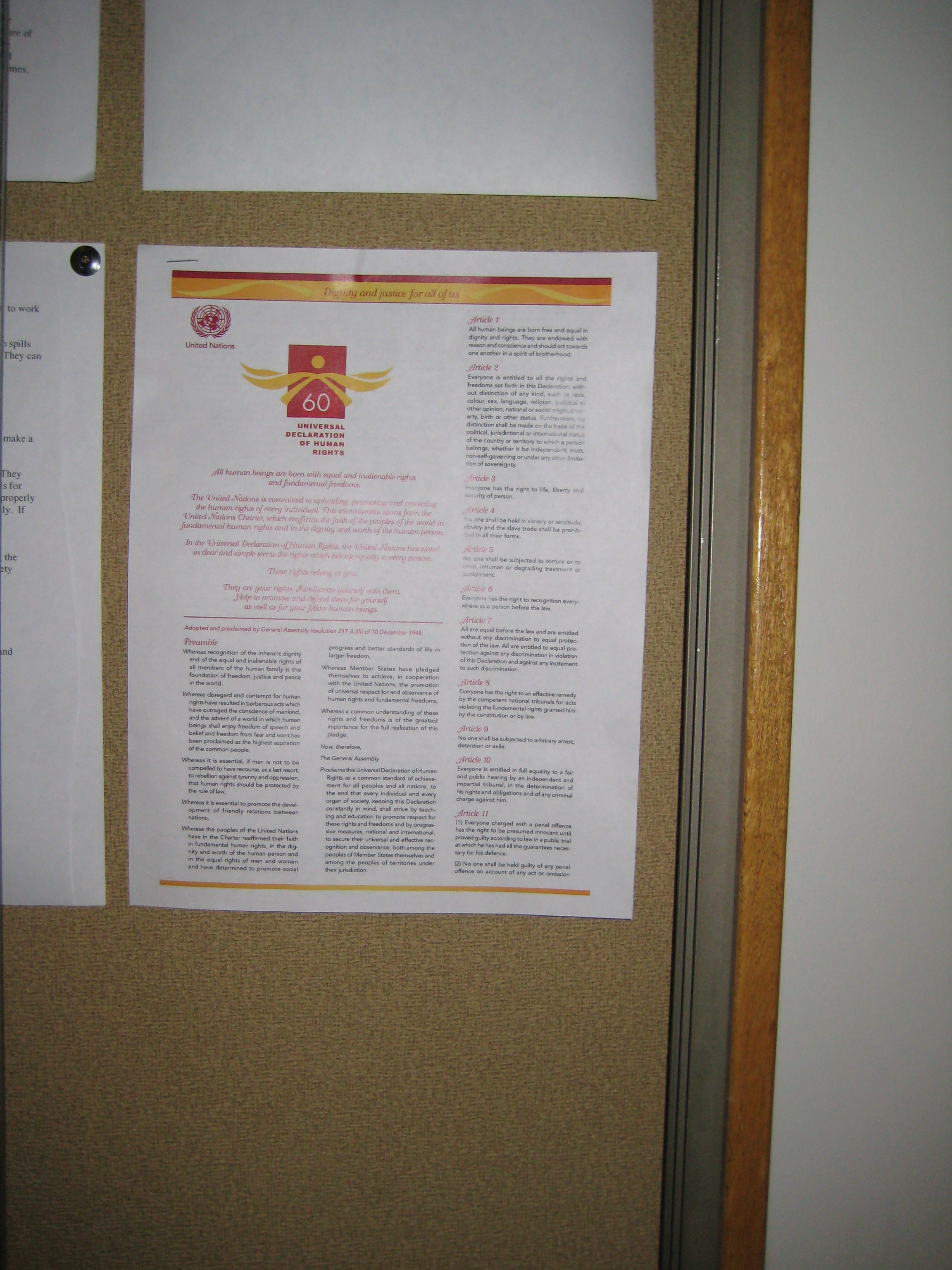 That evening I signed up for this task and broached the topic with Kari; he mentioned that (in clear violation of his right to rest and reasonable leisure time) he would be spending all of Saturday working and thus could easily post it while no one was around. On Friday I printed the rather lovely two-page PDF version in full color on the lab printer and handed it off. We determined that our workplace is actually pretty decent about upholding our universal human rights, but that such a declaration is still a neat thing to have posted.