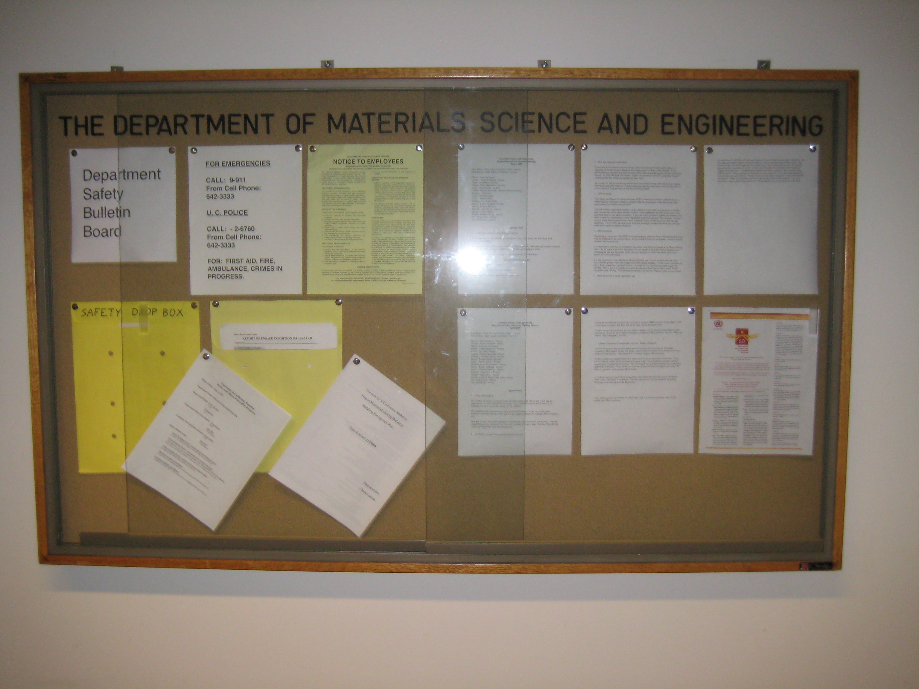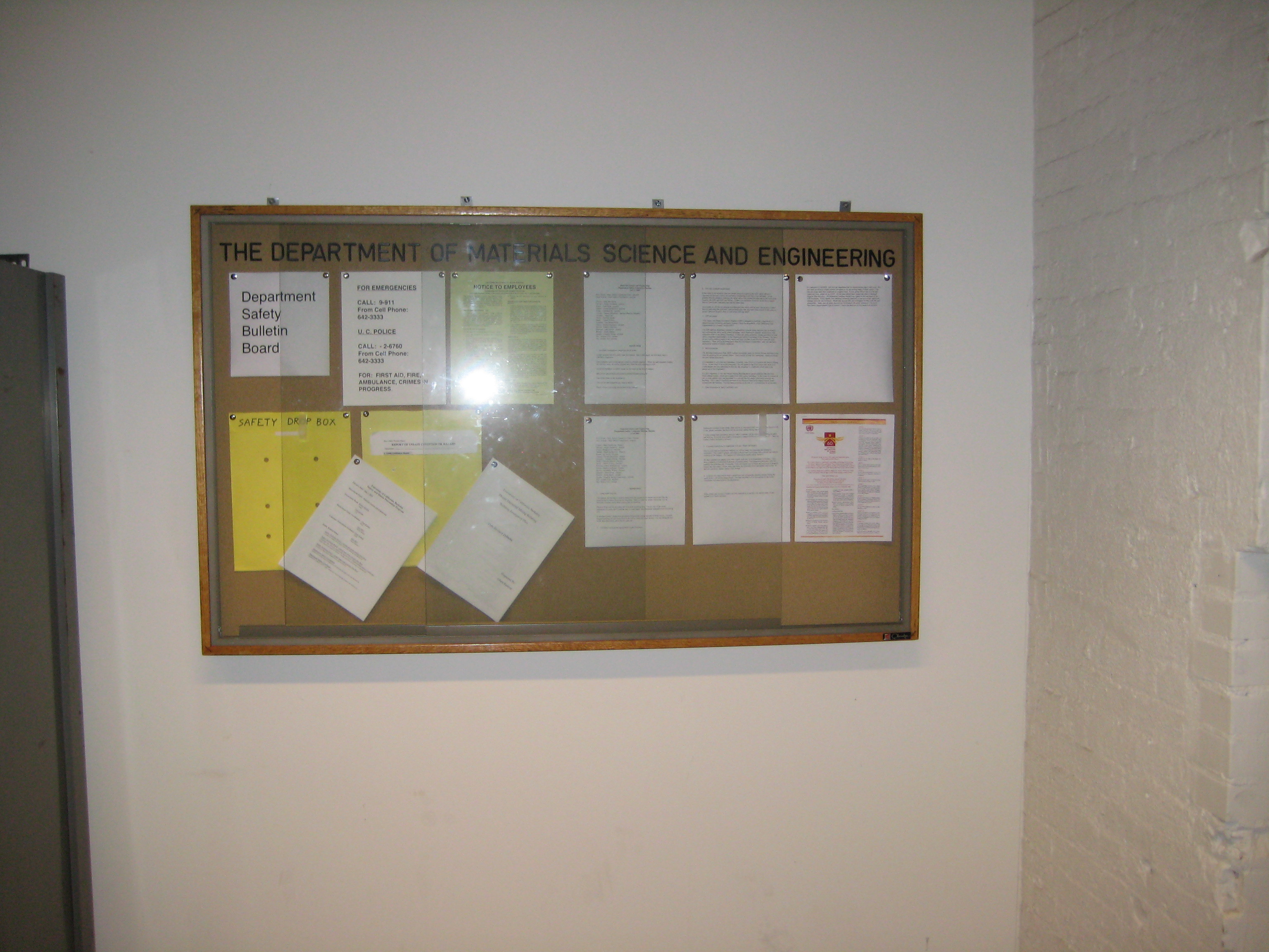 The other day, though, I left lab by my normal route--downstairs past the chronically broken vending machine and complete lack of water fountain--and noticed something I had seen but not really registered before. Newly placed within the last semester or so there is a bulletin board in the basement/first floor of our building, on which are posted a few notices. Best of all, I noticed that it was not locked, in fact standing open with no locking mechanism to be found.