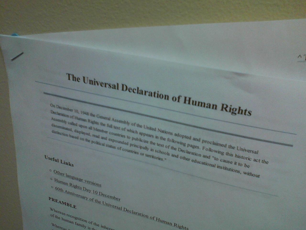 Two weeks ago, during my ten minute break (what else am I supposed to do on a ten effing minute break?) I posted the Universal Declaration of Human Rights in the Public Library faculty lounge in Northlake, IL. I trusted that from then on out they would be followed unwaveringly by everyone in the office or else receive punishment from the universe.