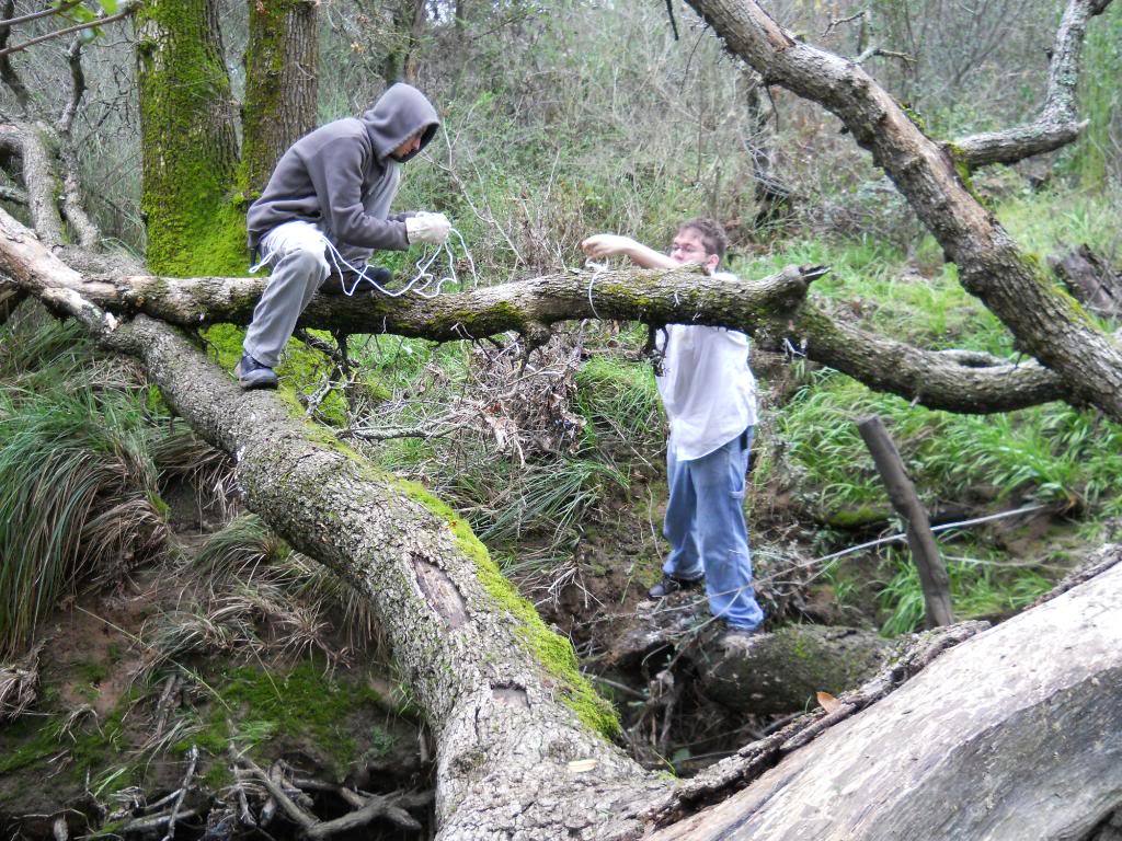 For almost three hours, Fettucini, Tirius and I went all spidery on that bunch of fallen branches, winding it about with whatever ropey substances we had on hand. Again, in a fashion of madness that only seems to come out amongst greenery, Fettucini ran to and fro across those dead, fallen branches, spinning our web of junk, while I took a perch and helped anchor along the bottom and Tirius remained warm on our behalves while taking pictures.