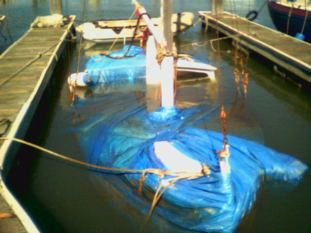 That's a sailboat. Or, more accurately, that is a sailboat that has sunk at the dock. They tried seveal times to raise it, but it just ripped apart and was finally hauled away. Poor little boat. Someone used to love it.