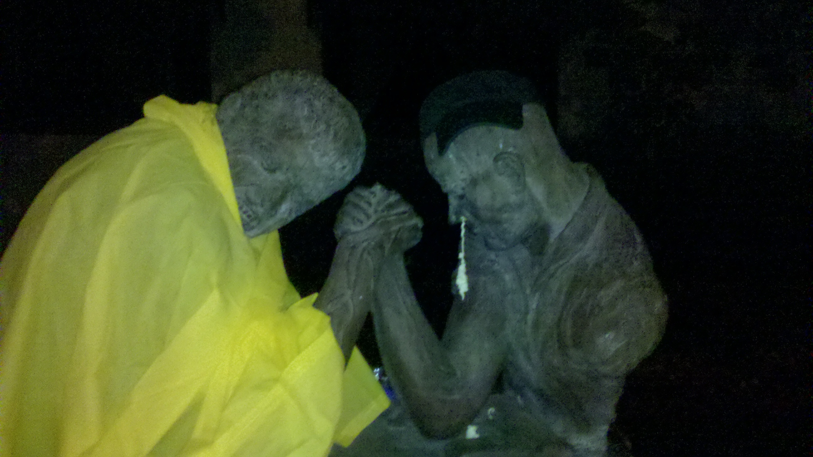 We decided the statues needs some sprucing up....that just because you are in the mist of a heated wrist wrestling battle..doesnt mean you cant dress for the weather and be fashionably accessorized. So we created TaDa Art....for all the public to see...