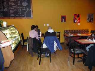 To console my near vacant conscience, we head back to the coffee shop for approval of the silly letter replacings, only to find that a show is about to start.